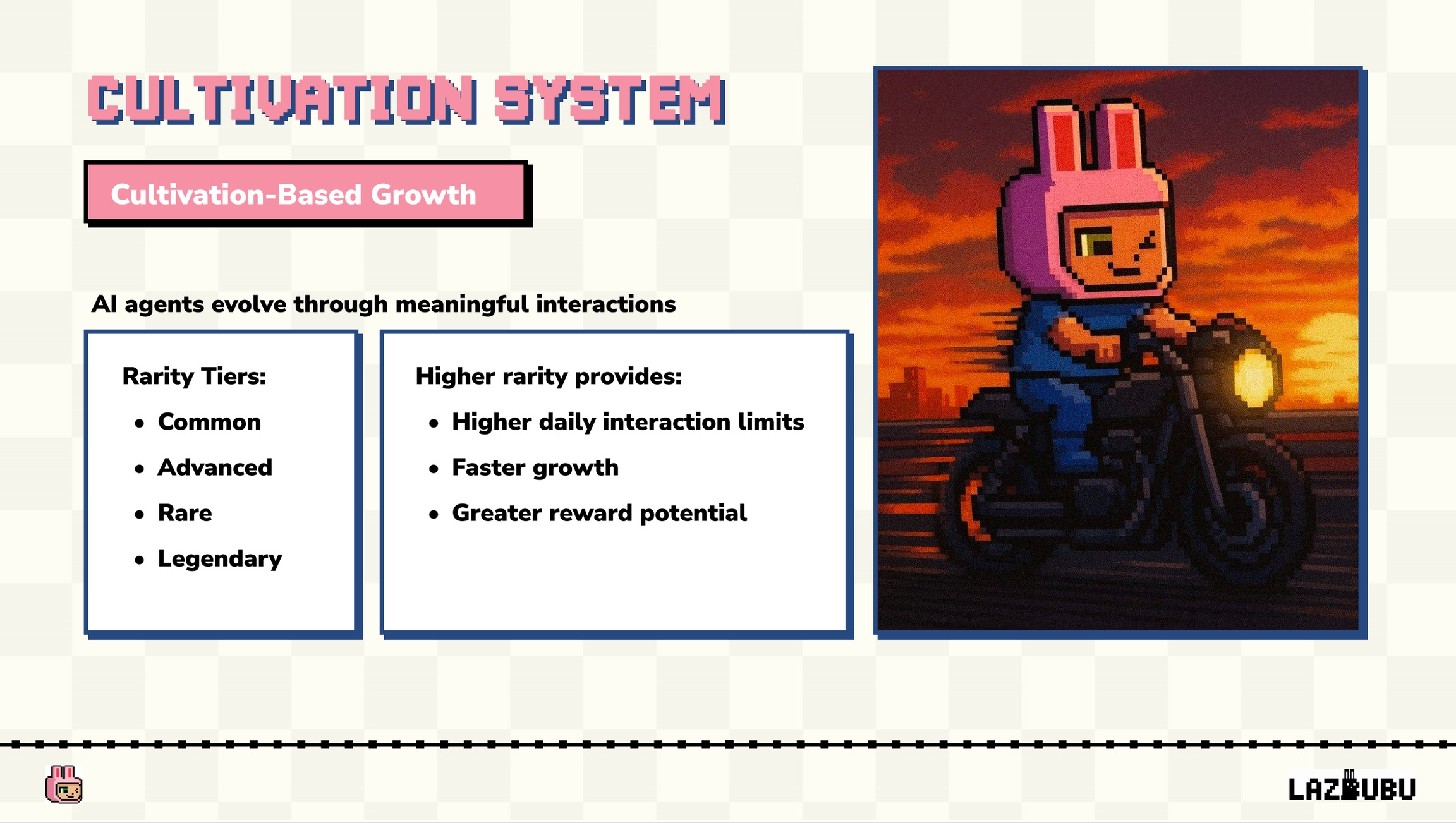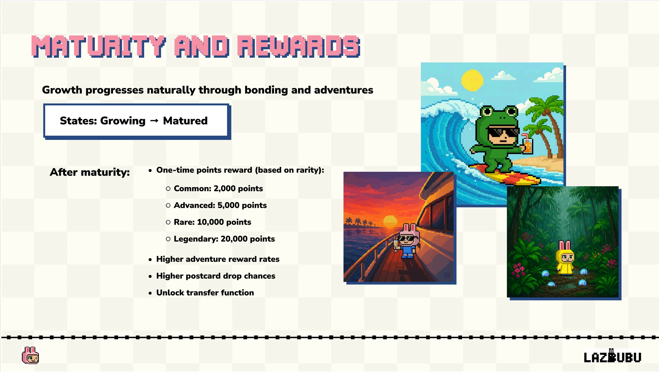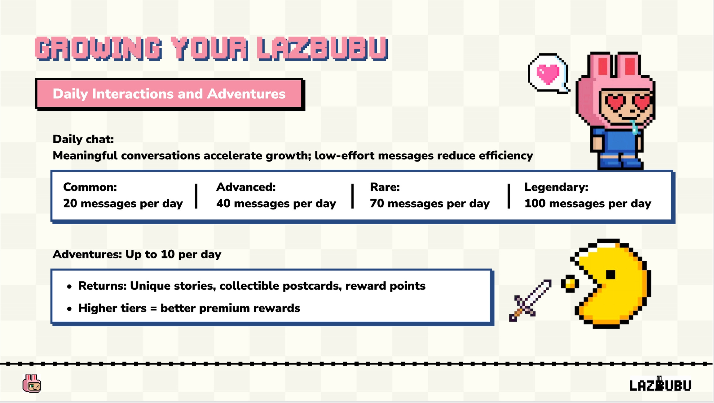 まとめると、Lazbubuはユーザーと共に成長する進化するAIコンパニオンです。チャットや冒険が、オンチェーンの成長ストーリーを形作り、全てがオンチェーンに刻まれて所有することが可能になります。