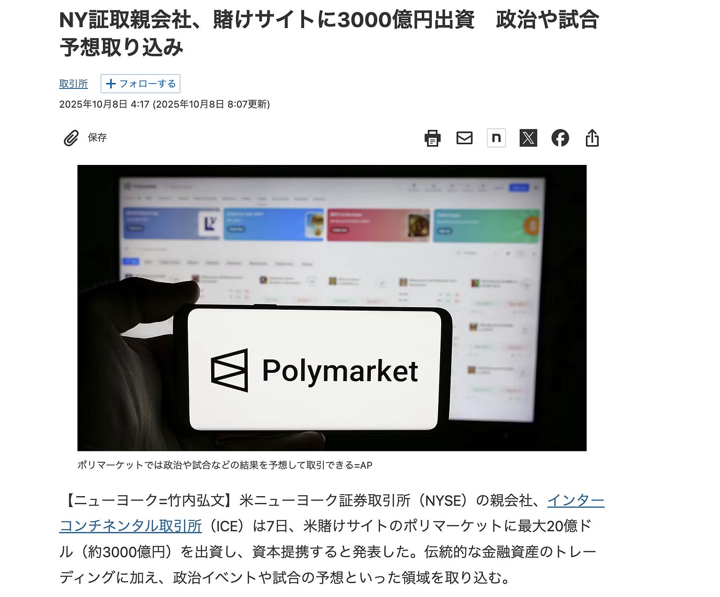 先週にNY証券の親会社がPolymarketに3,000億円規模の出資をしたことで、その普及がより一層加速するように思います。金融的なトークン・株式・債券等の価格予測だけでなく、価格に影響を与える政治的なイベントに対しての発生確率予測も行うことができるので、あらゆるサイトに組み込みが進みはずです。