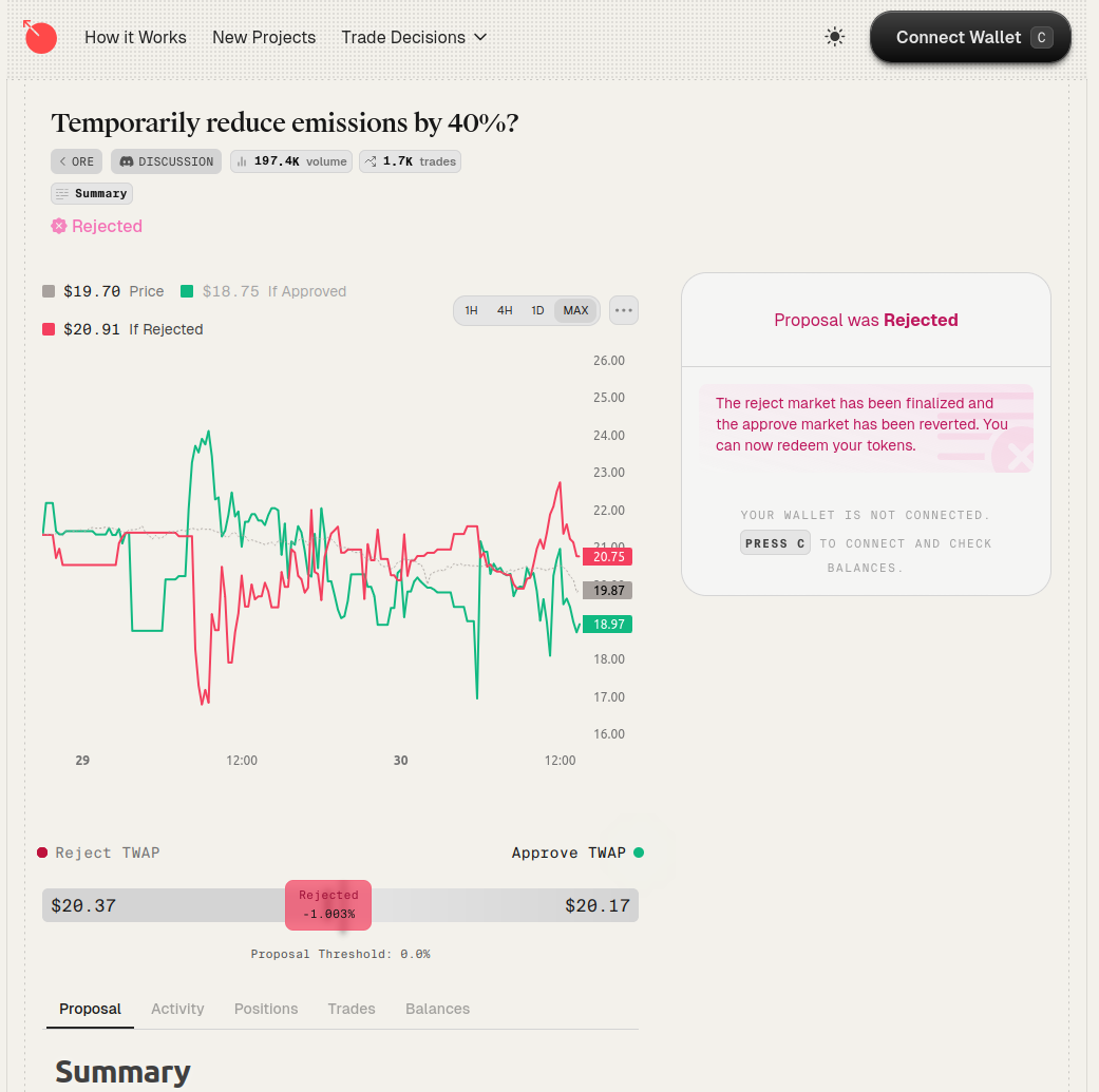 市場の立ち上げ:予測市場が開設されます。トレーダーはUSDCまたはそのプロジェクトの独自トークンを預け入れ、2つの派生トークンを受け取ります。「PASS」(提案がトークン価格を押し上げると賭ける)と「FAIL」(提案が価格を下げると賭ける)です。これらのトークンを取引することで、集団的な信念に基づいて価格が上昇または下落します。