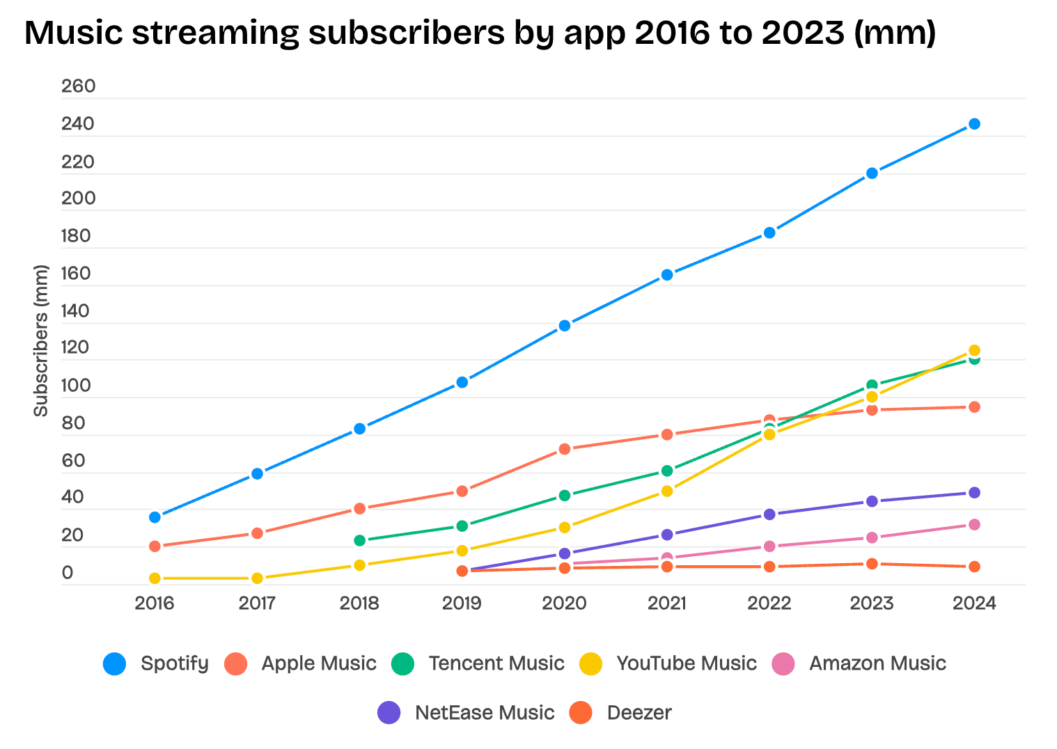 Spotifyに続き、Apple Music(2015年開始、2023年に約9,200万~9,300万加入者)、Amazon Music、YouTube Music、中国のTencent Music系列(QQ Music等)などがグローバルな配信プラットフォームとして存在感を持ちます。