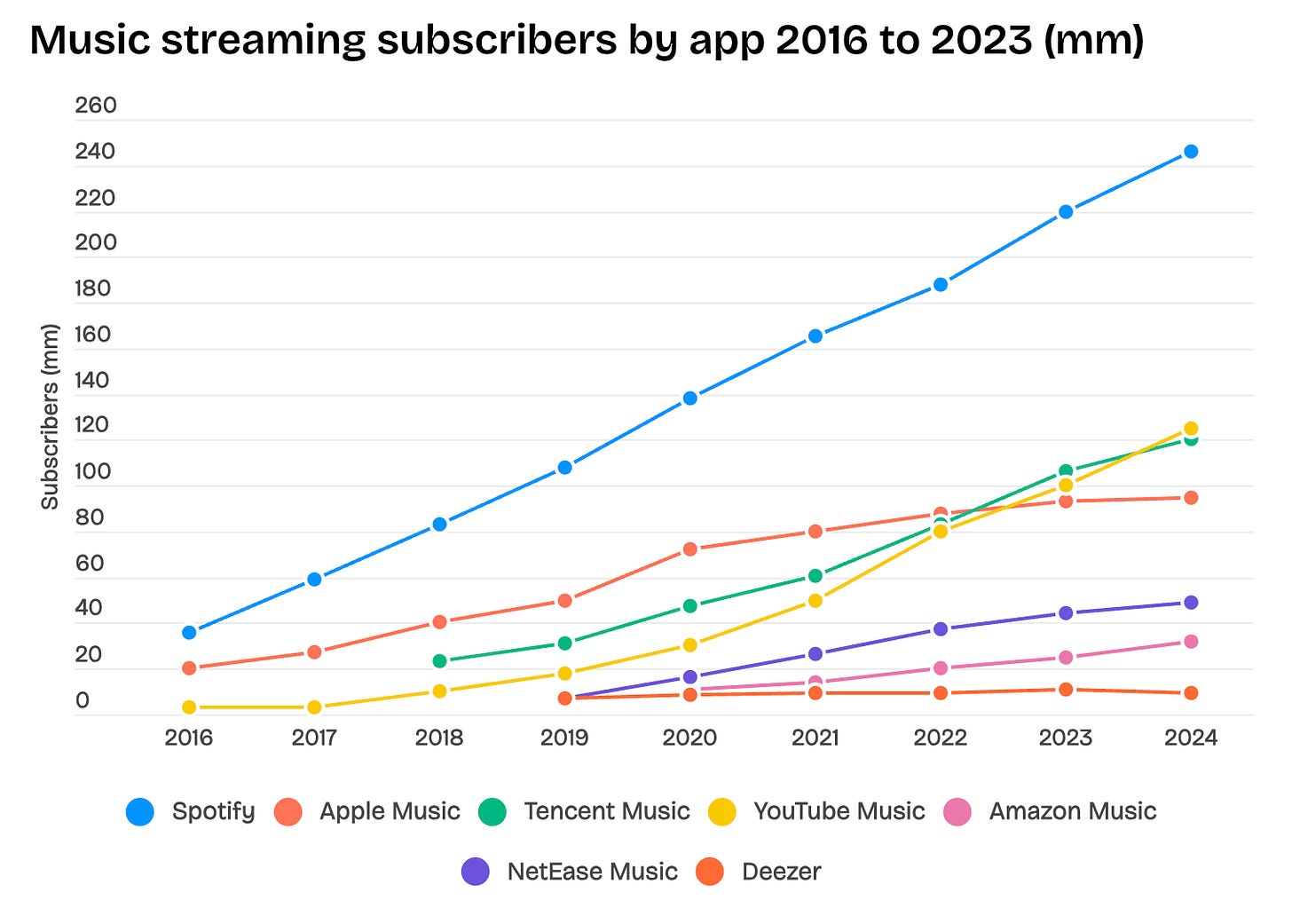 ストリーミング最大手のSpotifyは2008年創業のスウェーデン発サービスで、現在では月間アクティブユーザー6億75万人、うち有料会員2億63万人を擁するとされます。