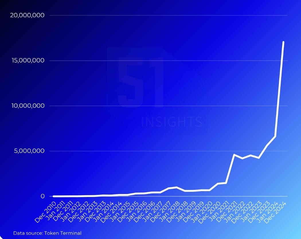 2024年12月に仮想通貨の世界の1日あたりのアクティブユーザー数は1,800万人を超え、前年比202%増を記録