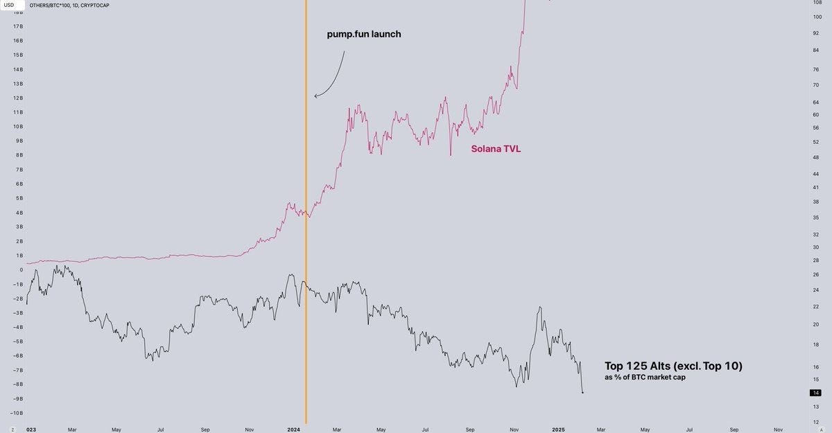 2月4日のXの投稿で、暗号資産アナリストのマイルス・ドイチャー氏は、大きな「アルトコインシーズン」が起こっていない理由は、通常、時価総額上位200の暗号資産に流入する投機資金が、代わりに時価総額の低いコイン、主にPump.funで発行されたミームコインに流入しているためだと主張した