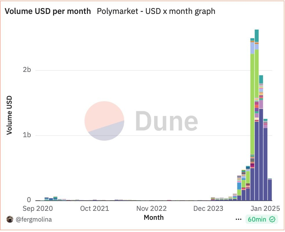 1、ポリマーケットの取引量は2月に減少したが、アクティブユーザーは健全なまま