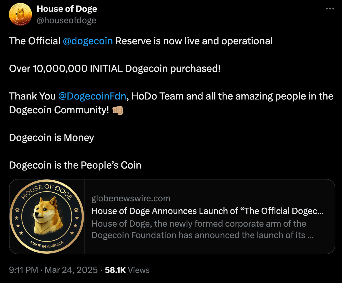 2025年3月24日、Dogecoin(ドージコイン)の開発・普及を支援する非営利団体「Dogecoin Foundation」の新たな法人部門「House of Doge(ハウス・オブ・ドージ)」が、「公式ドージコイン準備金(Official Dogecoin Reserve)」を設立したことを発表しました。