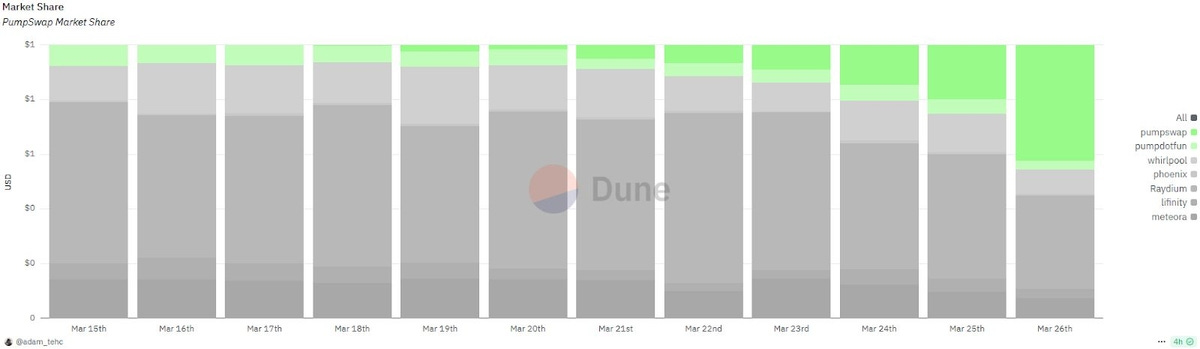 PumpSwapは3月26日にAMM市場シェアの42.3%を獲得し、Raydiumは34.2%
