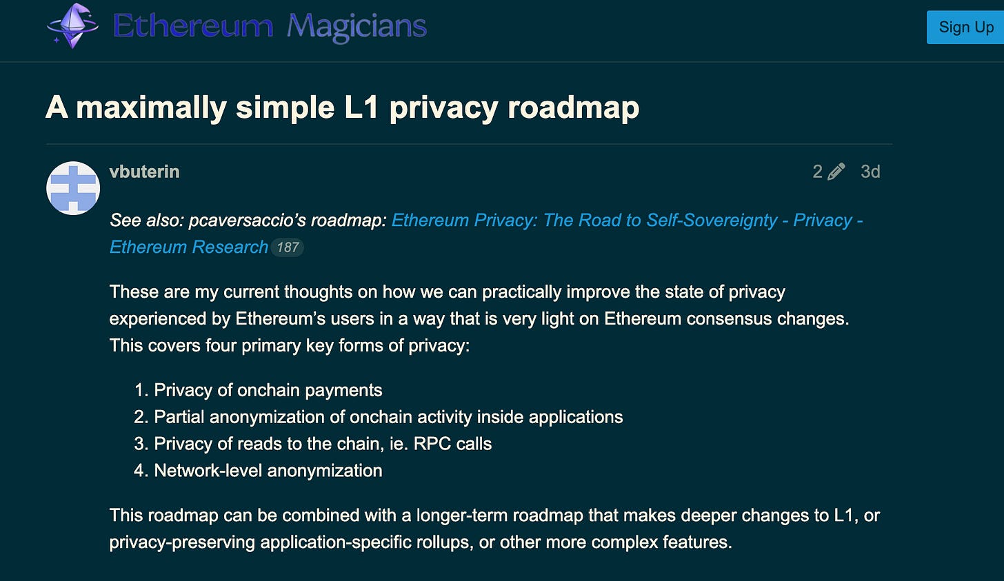 4月10日のブログ投稿で、ブテリン氏は「イーサリアムのコンセンサス変更をほとんど行わずに、イーサリアムのユーザーが体験するプライバシーの状態を実質的に改善する」方法を含む「最大限にシンプルなL1プライバシーロードマップ」を提案した