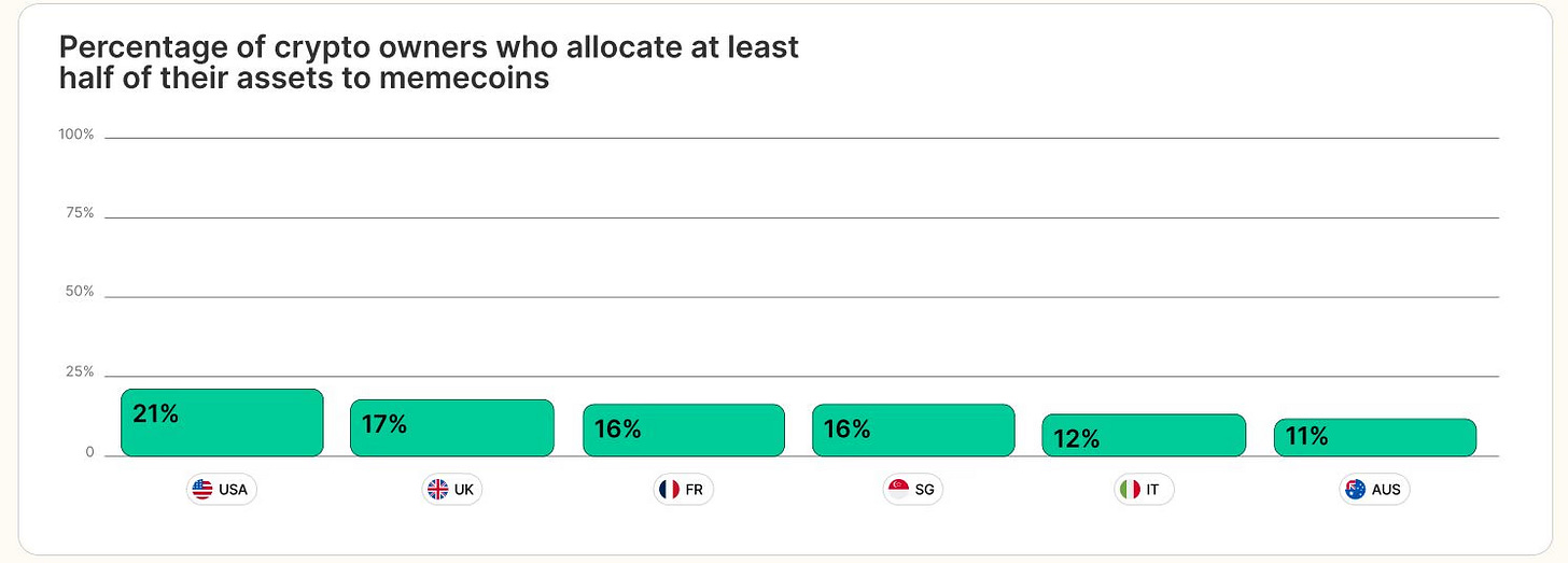 ミームコイン保有者の大多数(94%)は、他の仮想通貨も保有していることが判明し、「ミームコインは、新規投資家にとってデジタル資産への重要な入り口となり、より広く普及し、より確立された仮想通貨への投資につながるきっかけとなっている」と報告書は述べている