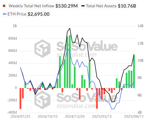 イーサリアム(ETH)スポット上場投資信託(ETF)は、過去1週間で5億3000万ドルを超える資金流入を集め、2024年12月以来最高の週を迎えている