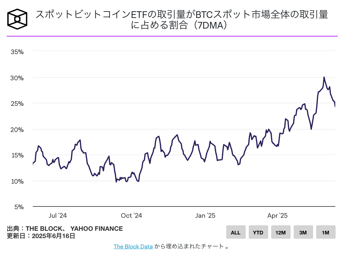 スポットビットコインETFはビットコイン現物市場全体の取引量の25%を占めている