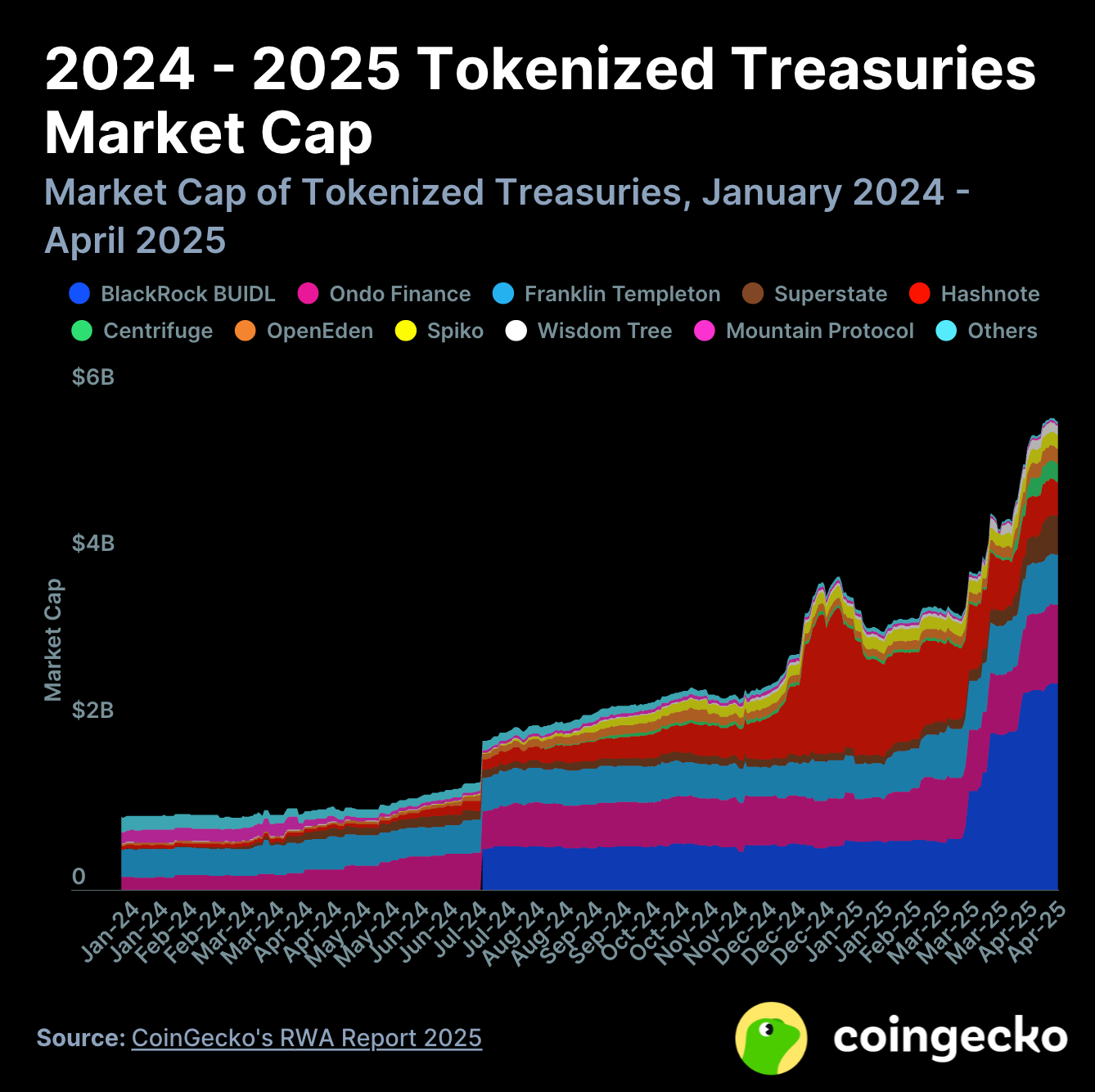 CoinGeckoのRWAレポート2025によると、トークン化された米国債市場は2024年初頭から500%以上成長し、4月末には時価総額が過去最高の56億ドルに達した