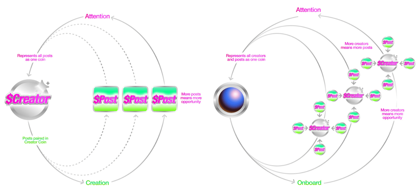 オンチェーン・ソーシャルプラットフォームZoraは、各投稿をトークン化する「$POST」と、クリエイター単位のトークン「$CREATOR」の2種類を導入し、コンテンツとクリエイターの価値をそれぞれ売買可能にする新システムをローンチしました。