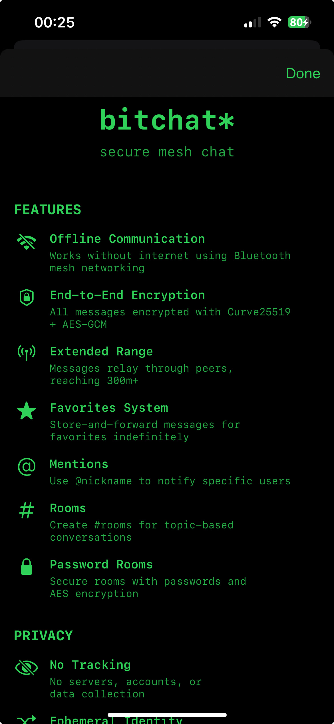Bridgefyなど既存のBluetoothチャットアプリもありますが、Bitchatはノードによる自律メッシュ形成、ストア&フォワード(中継キャッシュ)機能、エンドツーエンド暗号化を特徴とし、中央サーバや電話番号登録なしで動作します。