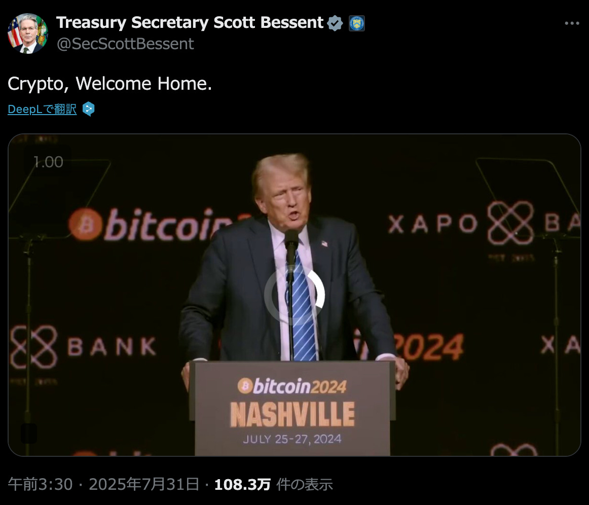 ホワイトハウスが仮想通貨に関する初の報告書を発表した後、スコット・ベセント財務長官は「仮想通貨、おかえりなさい」と投稿
