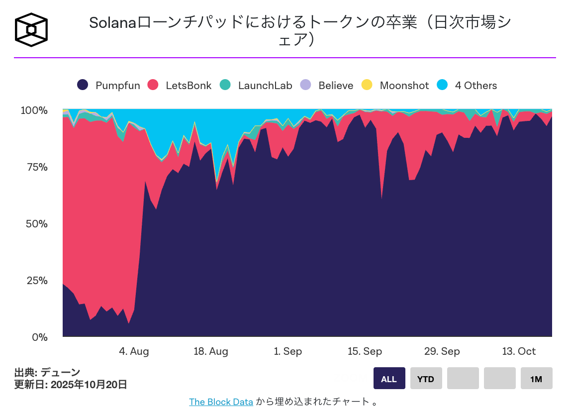 Pump.funは現在、日次トークン卒業市場のシェアの95%を占めています。これは、LetsBonk、Believe、Moonshotといった競合他社がこぞってその優位性に挑戦した今夏初めから、大幅な回復を示している