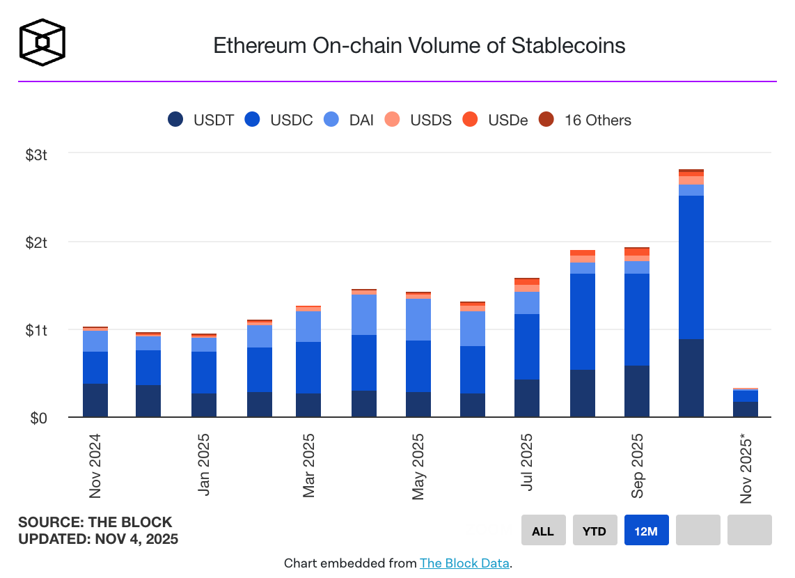 イーサリアムステーブルコインの月間取引量は10月に過去最高の2.8兆ドルを記録