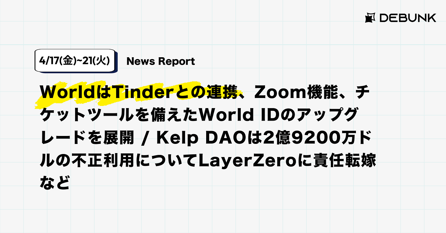 【4/17(金)~21(火)News Report】WorldはTinderとの連携、Zoom機能、チケットツールを備えたWorld IDのアップグレードを展開 / Kelp DAOは2億9200万ドルの不正利用についてLayerZeroに責任転嫁など