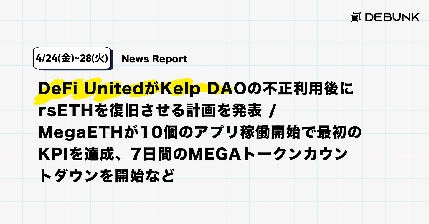 【4/24(金)~28(火)News Report】DeFi UnitedがKelp DAOの不正利用後にrsETHを復旧させる計画を発表 / MegaETHが10個のアプリ稼働開始で最初のKPIを達成、7日間のMEGAトークンカウントダウンを開始など