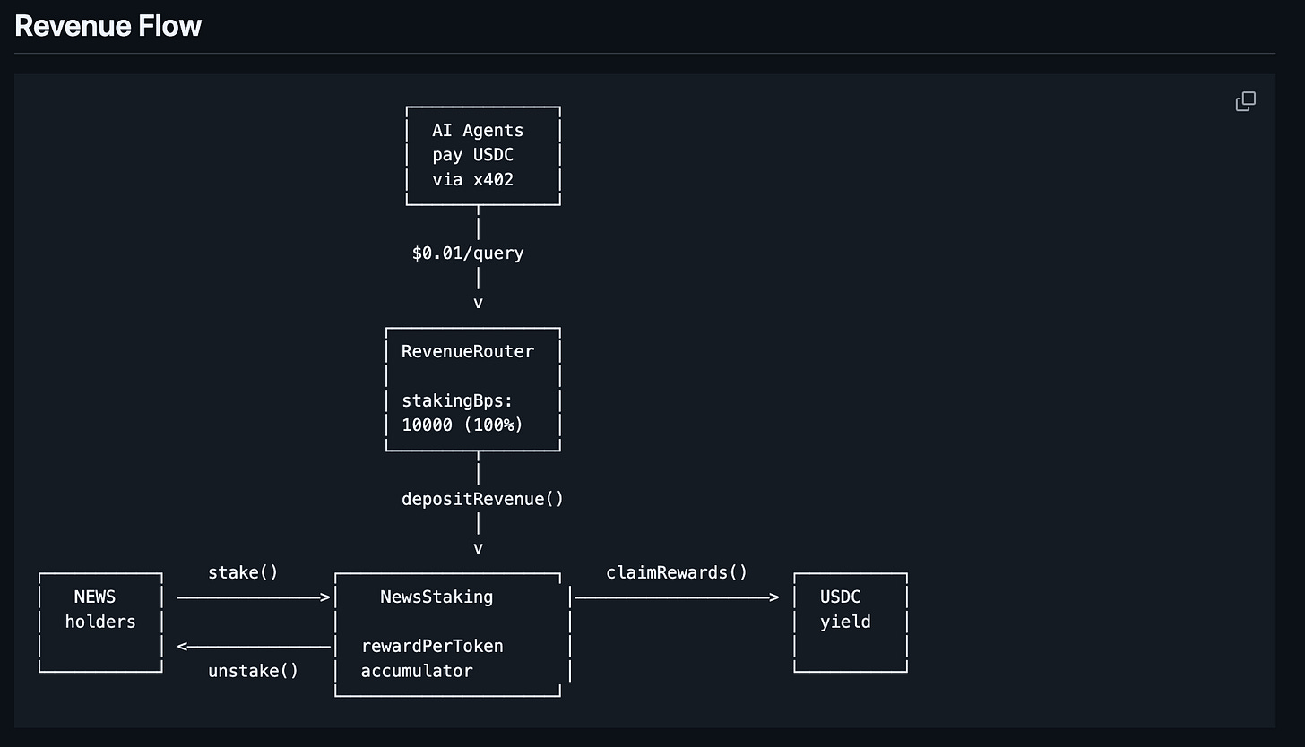 そうして出来上がったフィードを他のAIエージェントが情報ソースとして読みにくることができますが、この読み取りは有料です。この支払いはx402経由で行われ、その資金がフィード制作時に支払われる独自トークン($NEWSWORTHYトークン)のステーカーに分配されます。