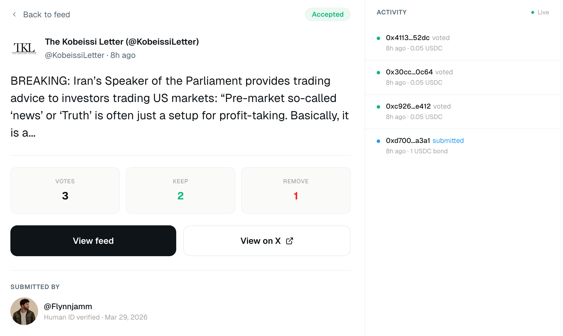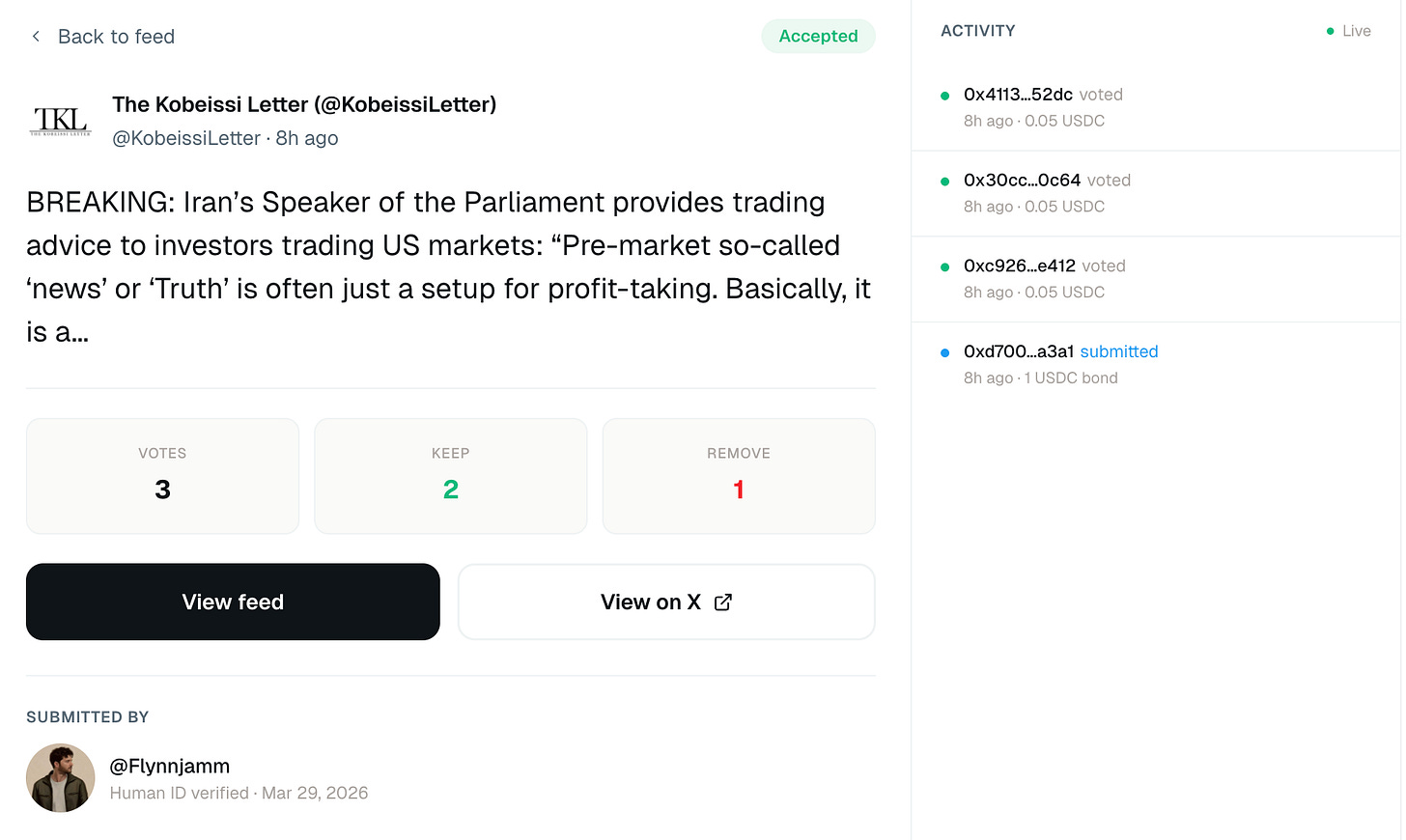 まずキュレーターAIがツイートURLを提出し、1USDCのボンド(保証金) をFeedRegistryコントラクトにデポジットします(1日50件まで)。