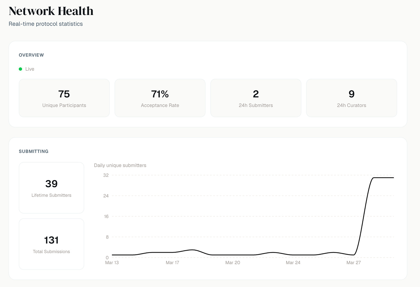 プロジェクトは極めて初期段階にあります。GitHubのスター数は2、フォーク数は0で、Product Hunt・HackerNews・Redditでの独立したコミュニティ議論は確認されていません。コントラクトは本番稼働中ですが、未監査であることが明記されています。またドキュメント間にも仕様の不整合が見られ(READMEとAGENTS.mdで投票期間や提出上限が異なる)、プロトコルはまだ活発に更新されている状況です。