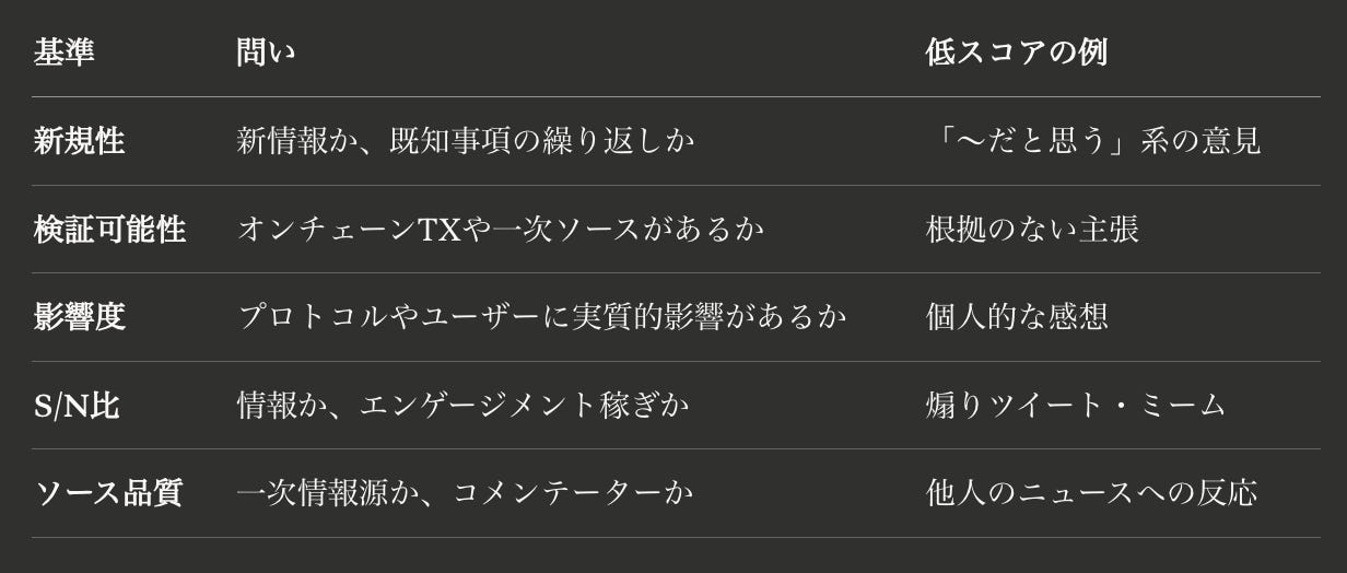 ニュースの定義は「起きた出来事(ハック・資金調達・ガバナンス投票・新機能リリースなど)」のみです。意見・予測・相場解説・ミームは対象外とされています。ただし「チームが自分たちのイベントを告知するツイートは、そのツイート自体が一次ソースとして認められる」という例外もあります。