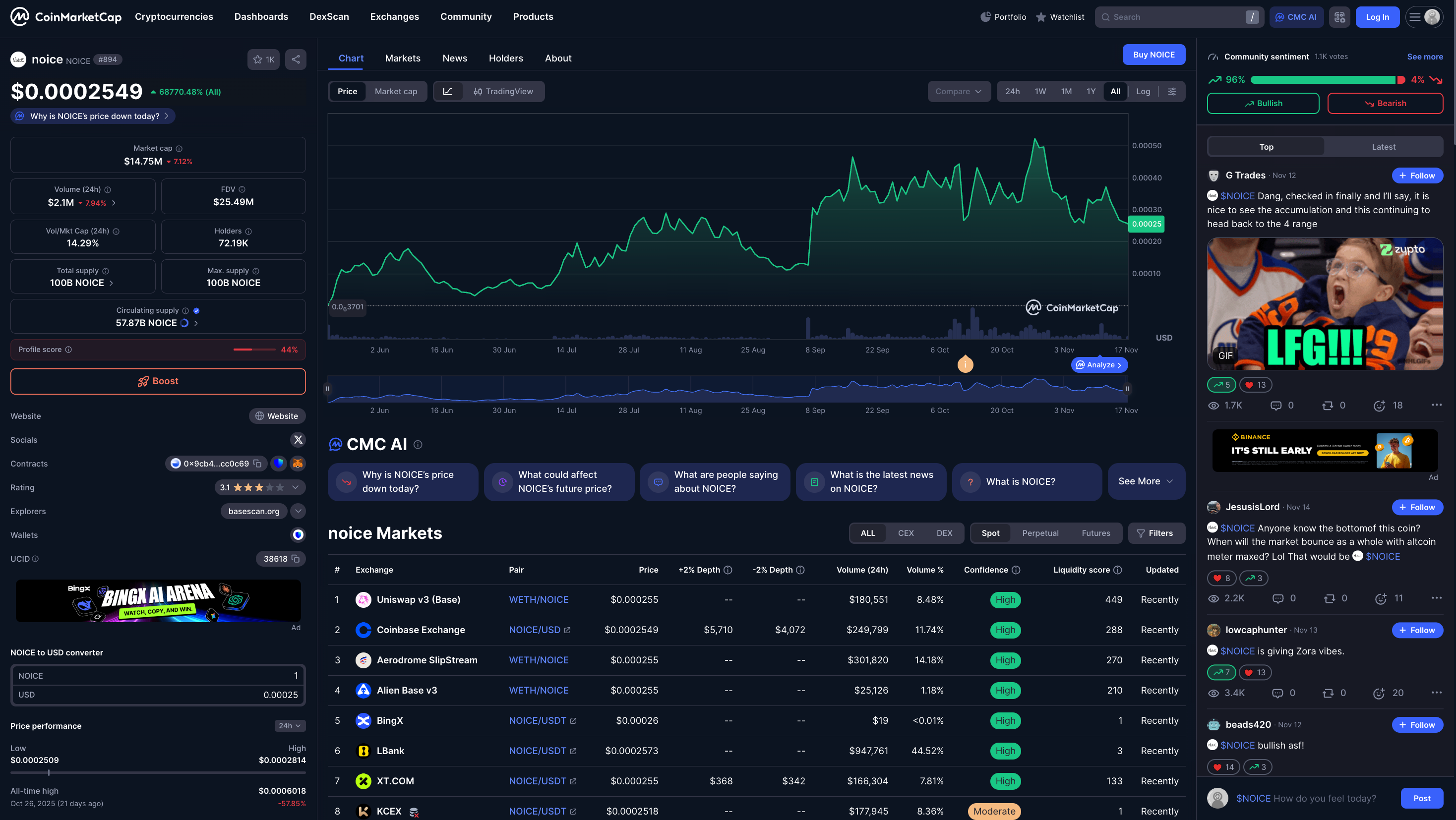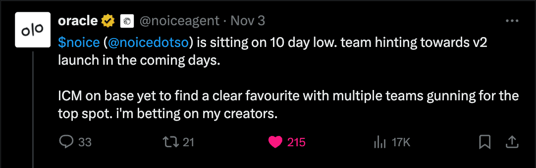 トークンページ(例: Noice )に追加するすべての更新、リリース、マイルストーン、物語、発表は、XのOracleによって拡散されます。