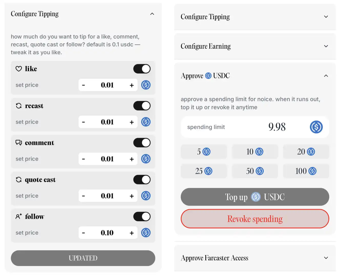 Noiceはソーシャル×資金調達プラットフォームで、Farcaster上のマイクロチップ送金アプリ(v1)からスタートし、ユーザーのSNS活動を暗号資産収益化につなげた。
