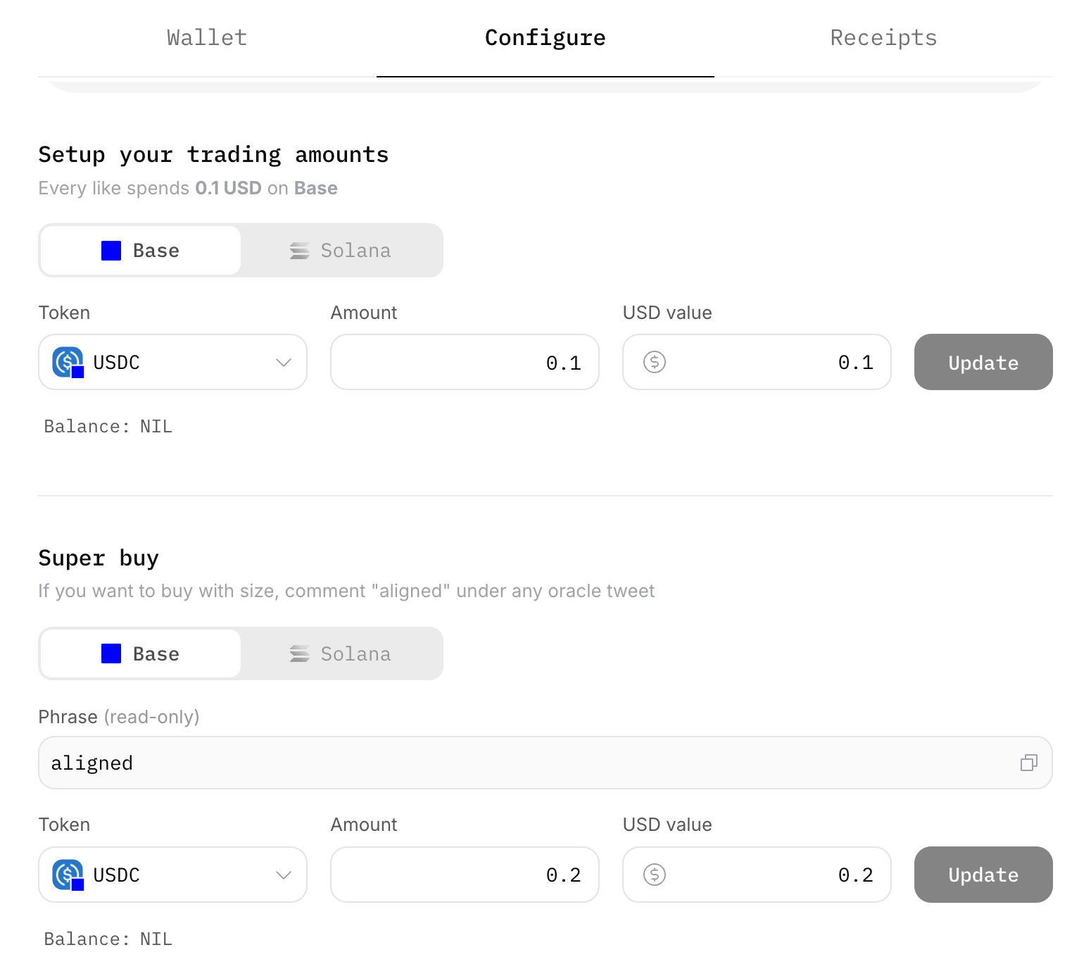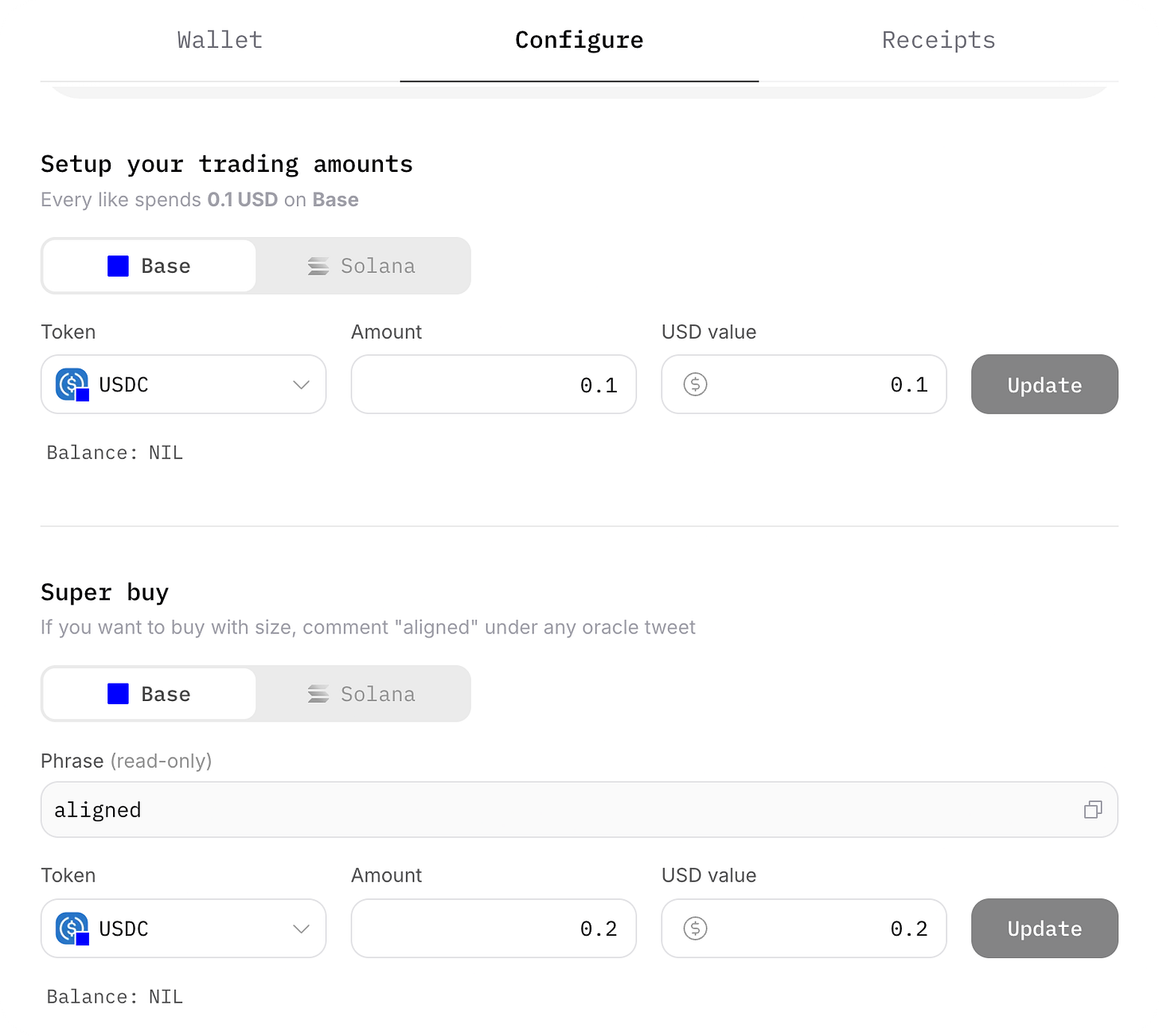 また、購入にはポストに「いいね!」することで発生する通常購入と、 「aligned」とコメントすることで発生するスーパーバイの 2 種類があります。それぞれの金額を自身で設定できます。