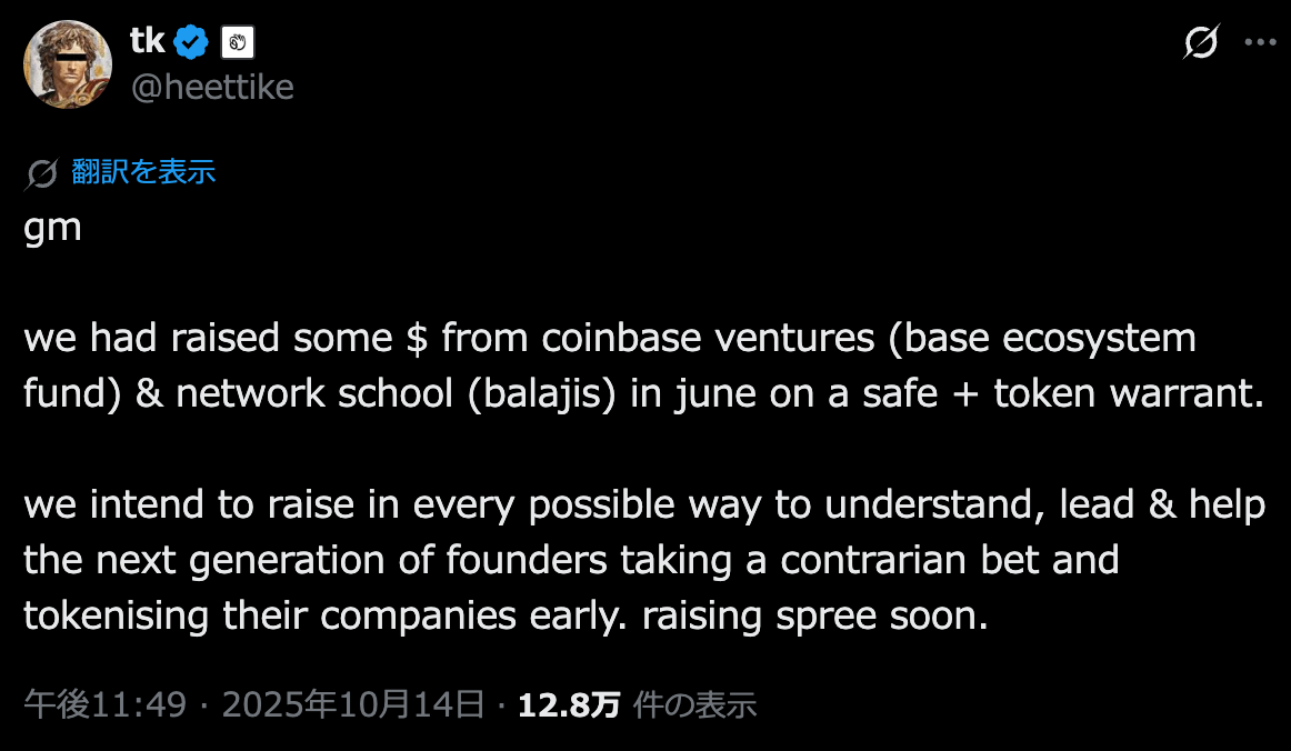 そして、2025年10月には実は6月の時点でCoinbase Ventures(Baseエコシステムファンド)およびNetwork School(Balajis)からSAFE+トークン・ワラントで資金を調達していたことも公表しました。