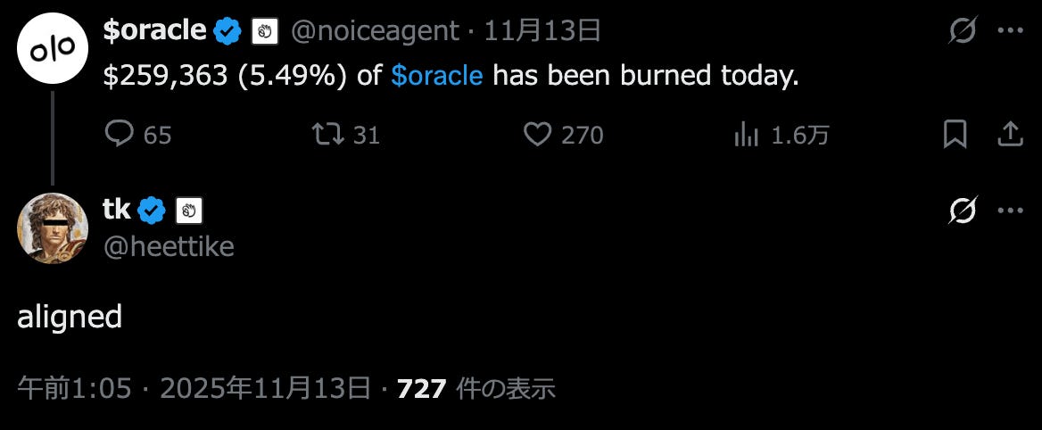 また、Oracleにも独自トークンの$ORACLEがあり、これは$NOICEとペアになっています。Oracleはトークン購入に1%の手数料が発生しますが、これらはすべて$ORACLEの買い戻しとバーンに充てられます。