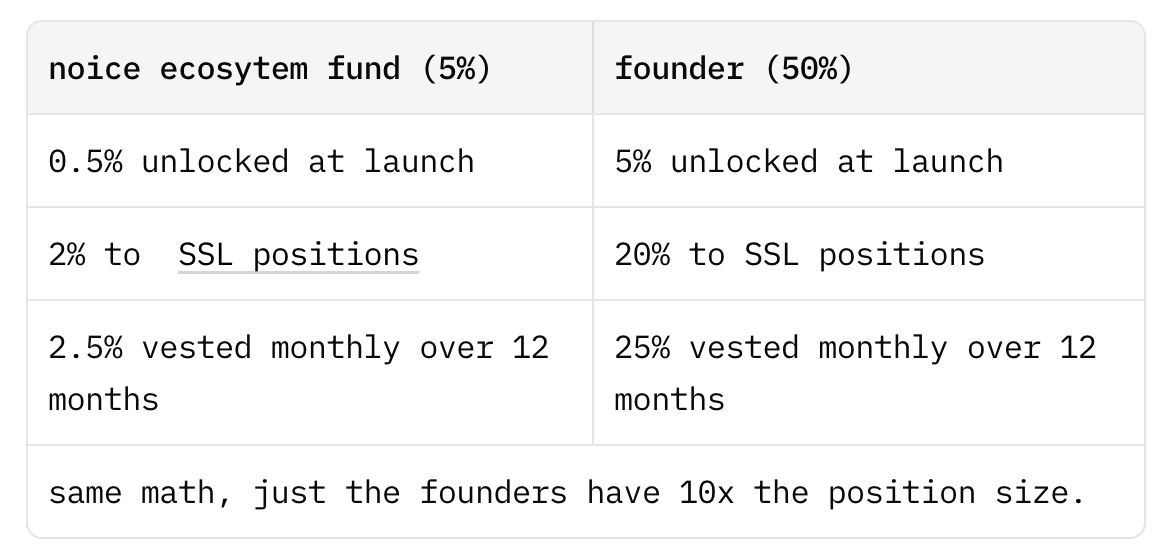 Noiceチームは$NOICEの10%を利用してNoiceエコシステムファンドを運営しています。まずTGE時に5%を10,000ドルで購入します。この5%はファウンダーと全く同じ仕組みでアンロックされていきます。