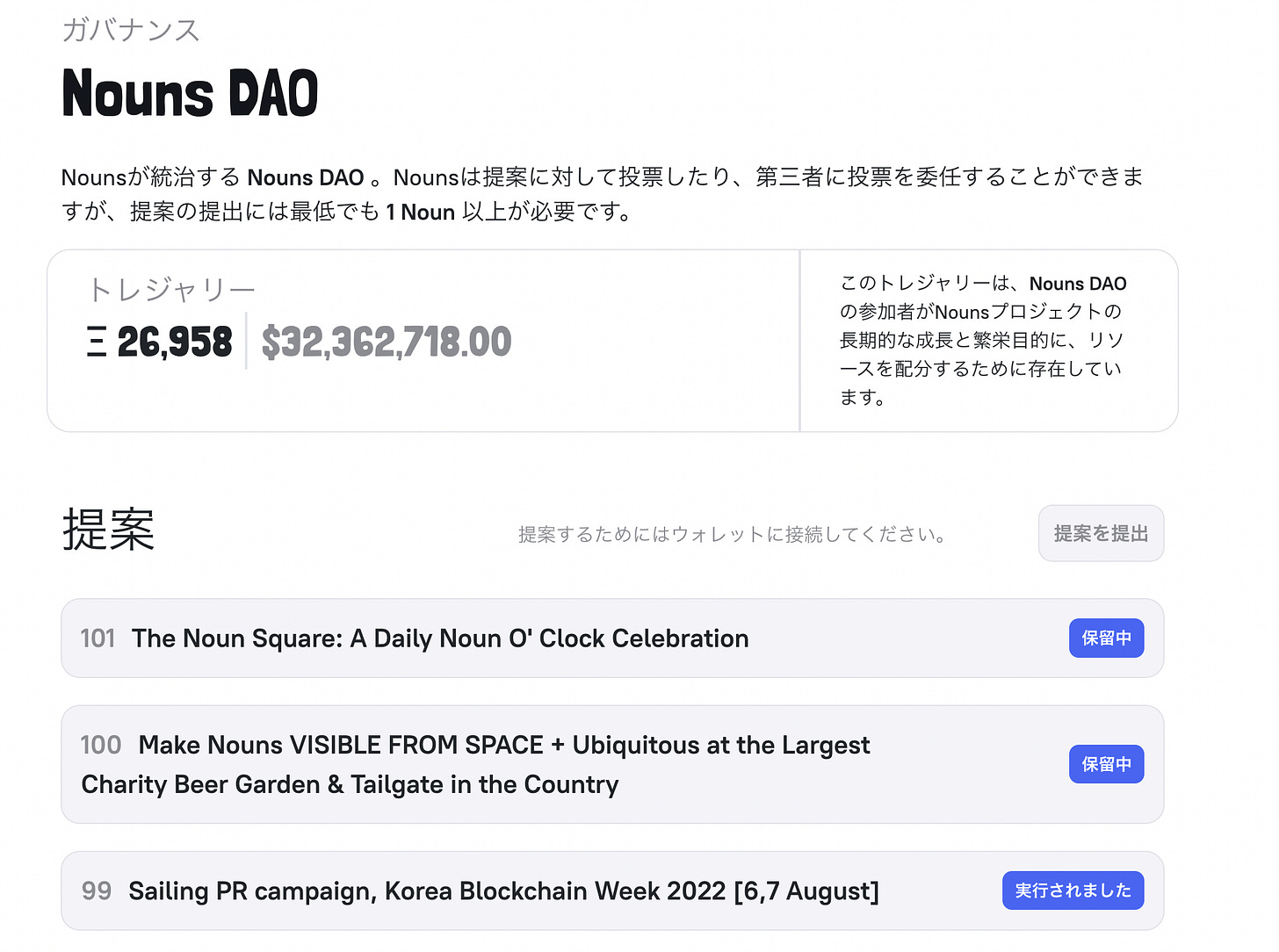ちなみにHP上のNouns DAOのページに、過去含めて全ての提案とそのステータスが載っています。(厳密に言えば、Nouns DAOへの提案はNoun所有者でなくても行うことができます。しかし、その投票権はNoun所有者しか持っていません。)