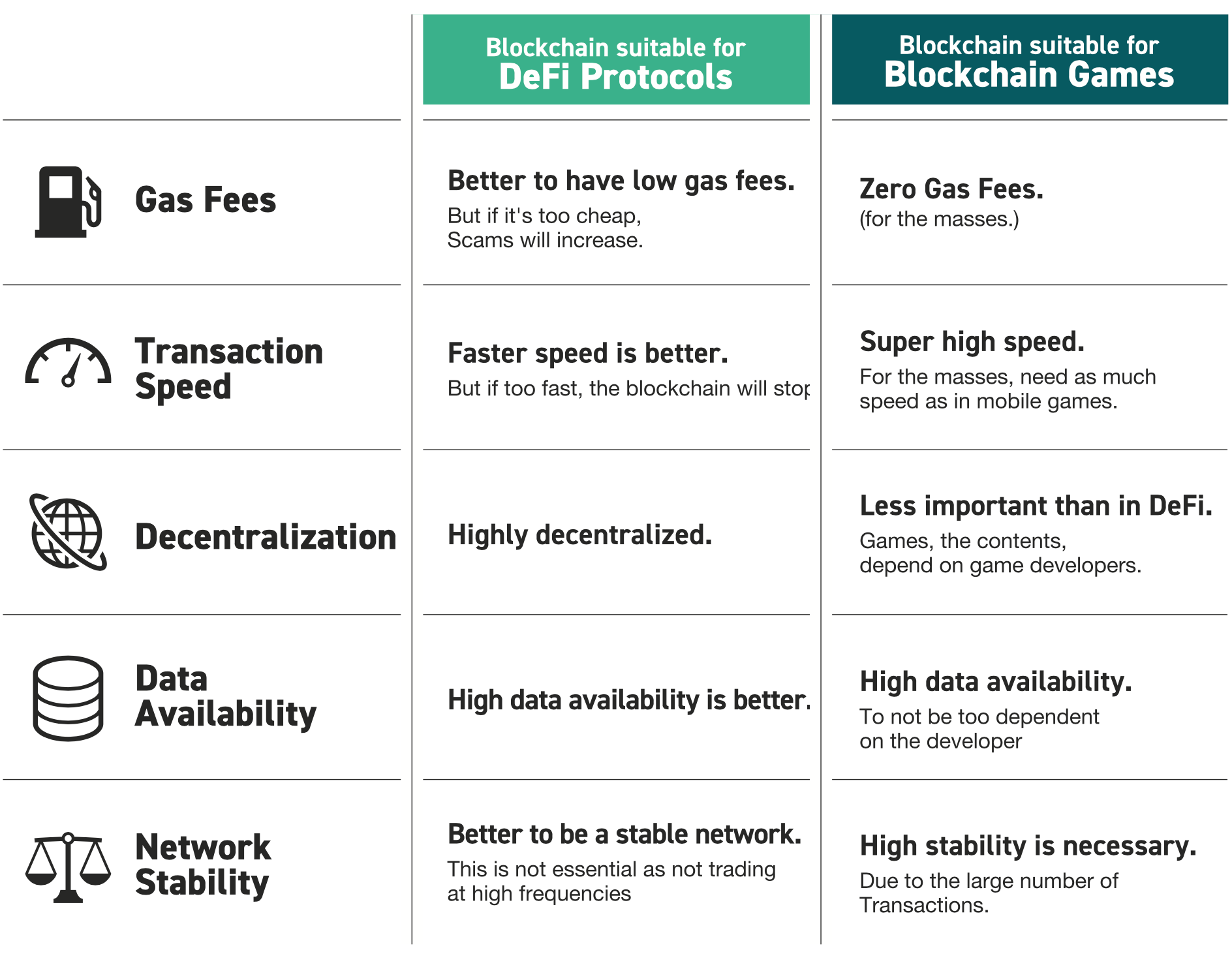 既存のチェーンはDeFiはNFTに特化しており、ゲームに特化していない。