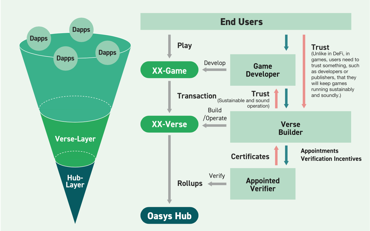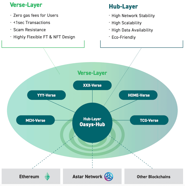 OasyチェーンはパブリックL1チェーン「Hub-Layer」とプライベートL2チェーン「Verse-Layer」の2層構造である(この仕組みをOasys アーキテクチャと呼ぶ)