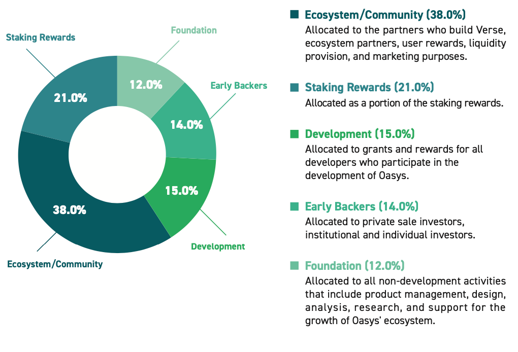 初期トークンは100億OASが発行され、以下の割合で分配されます。
