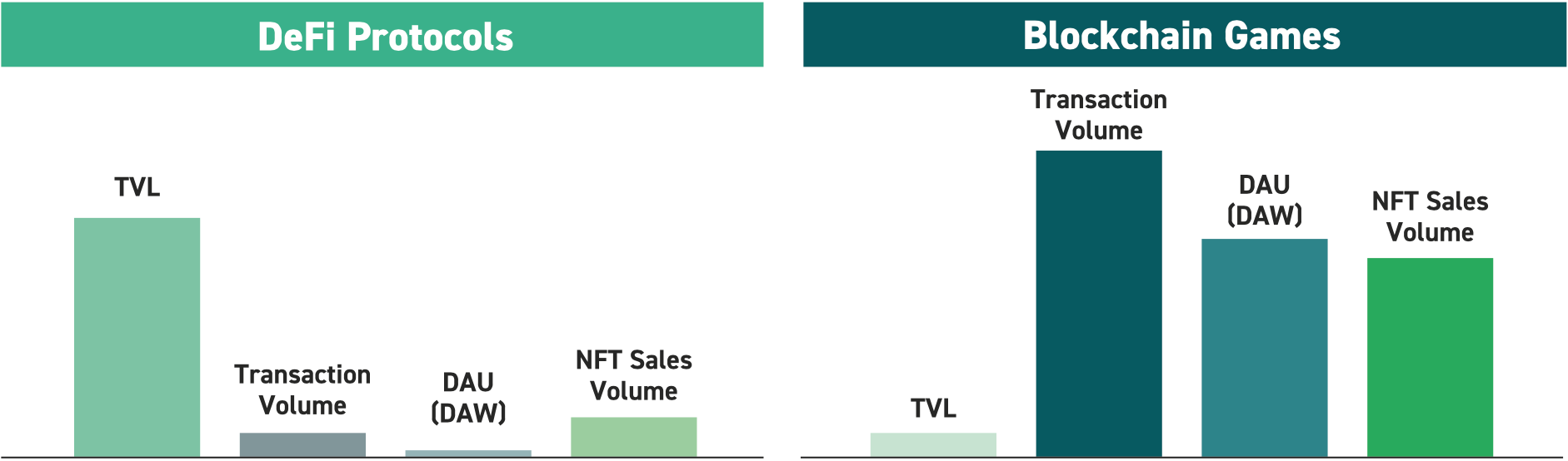 1)DeFiとBCG(ブロックチェーンゲーム)では使われる機能が違う。具体的にはDeFiはTVL(流通総額)が高いが、BCGはトランザクション数が多い