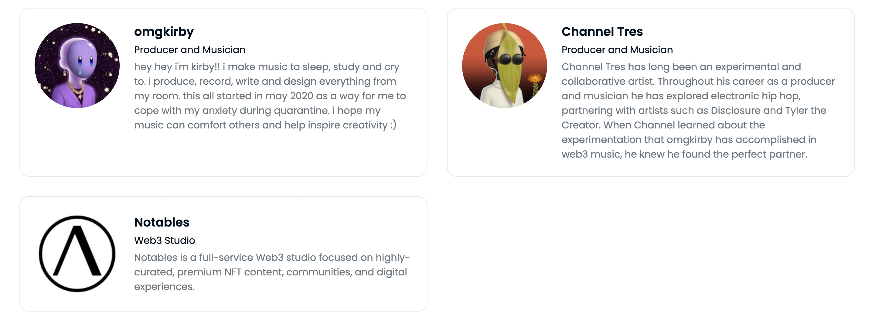 先ほど説明した通り、2人のアーティストのコラボによってリリースされたコレクションです。そして、NotablesというWeb3 Studioがバックアップに入り、運営されています。