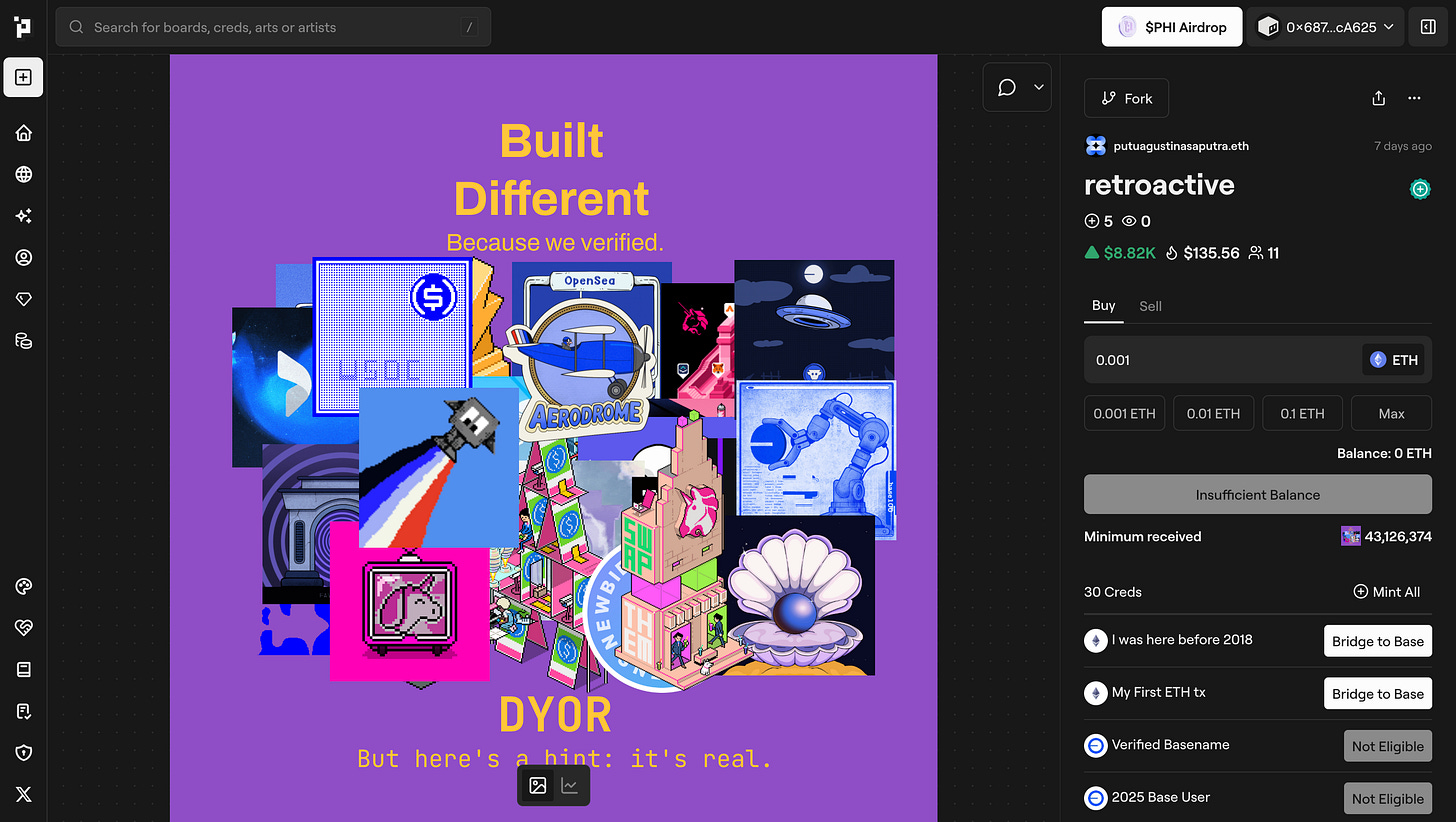 2022年のPhi Land(ENS連動のメタバース型)から、2024年にBase上でPhi Protocolへ進化し、「Cred」と呼ばれる検証可能な実績証明を誰でも発行できる仕組みを導入。
