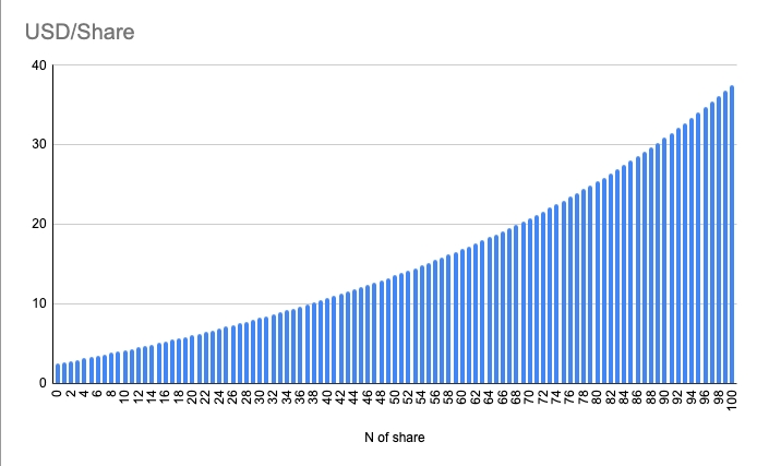 また、CuratorはどのCredが人気かを顕在化するためにCredのシェアを売買します。各Credに対して100のシェアが存在し、Curatorはそれを購入することでCredミント手数料の一部を享受できます。初期購入ほど価格が安く100に近づくにつれて値段が上がります。