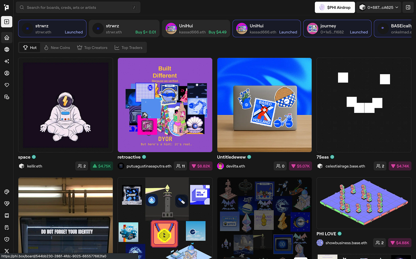 2025年10月にはトークン$PHIと、Boardごとに独自ERC-20を発行できるBoard Coin機能を同時リリースし、経済とIDを統合したエコシステムを展開。