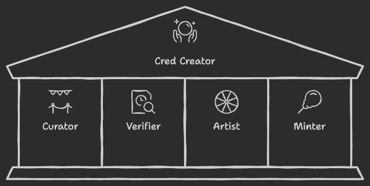 より詳しい説明をすると、Phi Protocolには5つの役割が存在し、それぞれが存在することでCredの作成と収集をコミュニティ主導で実現しています。