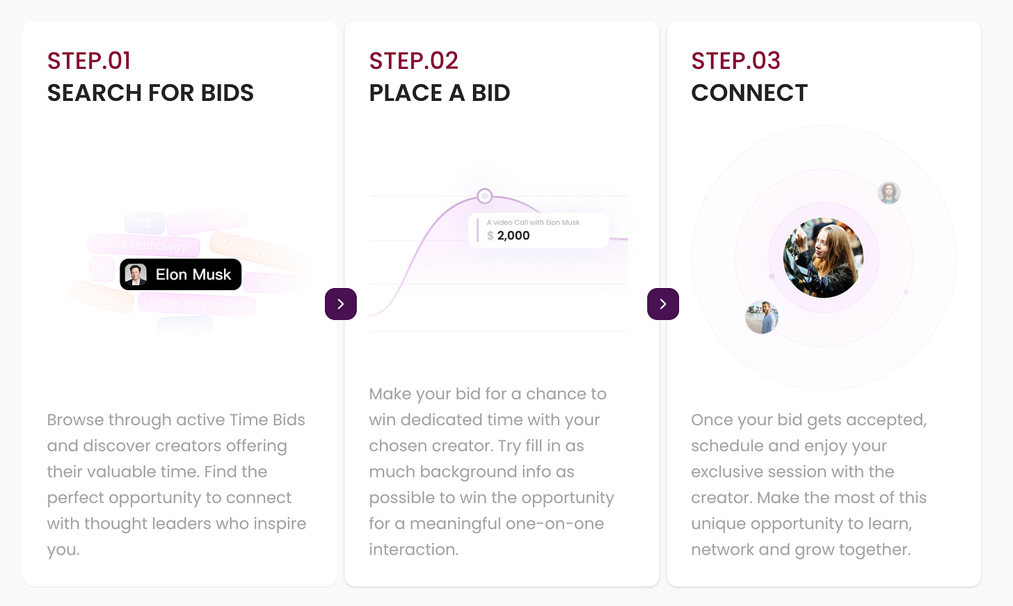 専門家やインフルエンサーなど「時間」を提供できる人材の時間枠をオークション形式で販売するサービスです。Pieverseプラットフォーム上で提供者の専門性はLinkedIn経由で検証され、落札者(時間を購入したユーザー)はZoom等を通じて直接その提供者とコミュニケーションできます。