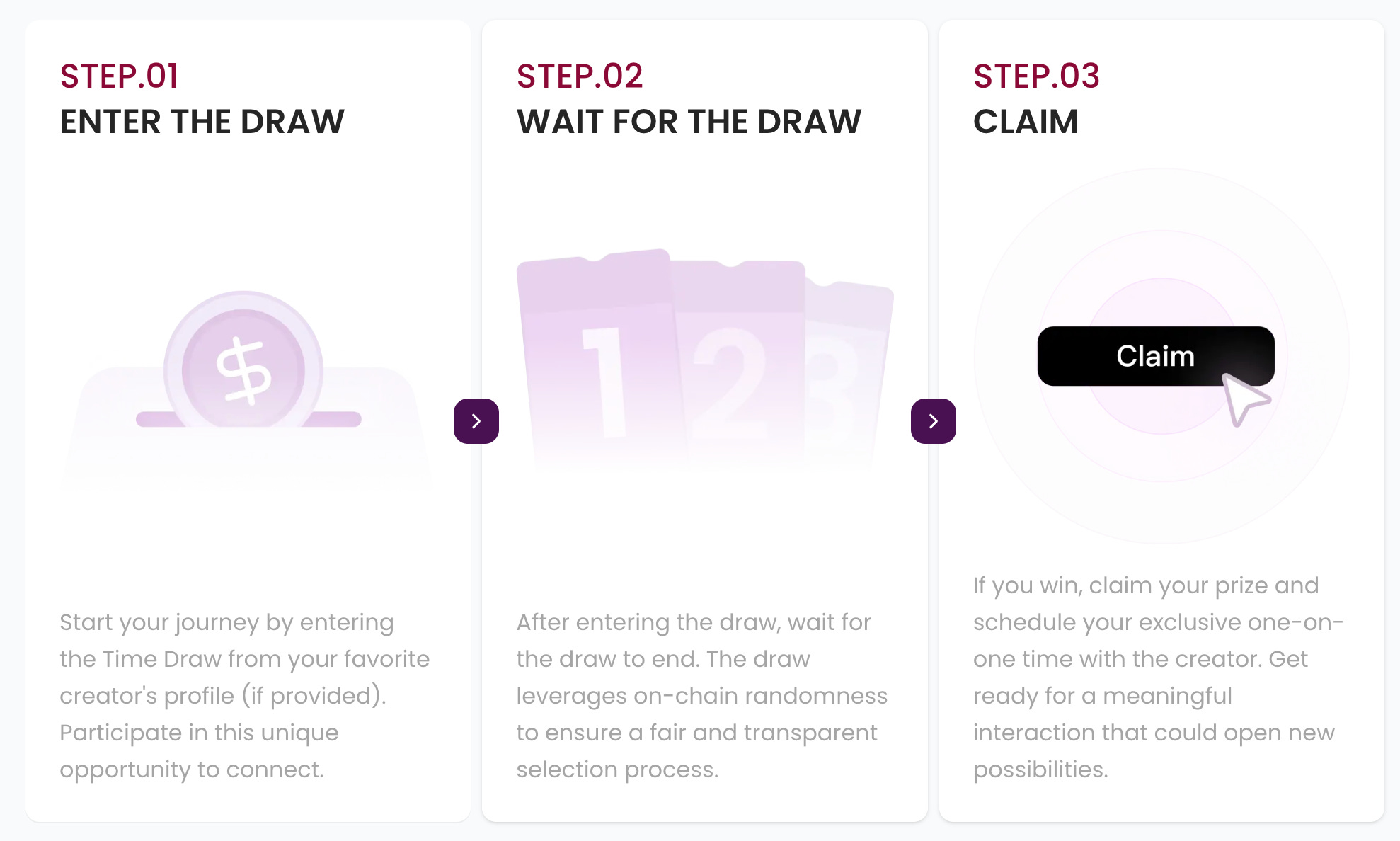 有名投資家・トレーダー・芸能人などとのプライベートな対話の機会を、抽選(宝くじ)方式で提供するサービスです。参加希望者は一定の条件(トークン保有量など)を満たすことで抽選にエントリーでき、当選すれば対象人物との1対1セッション等に参加できます。資金力に左右されず誰にでもチャンスを提供する点が特徴です。