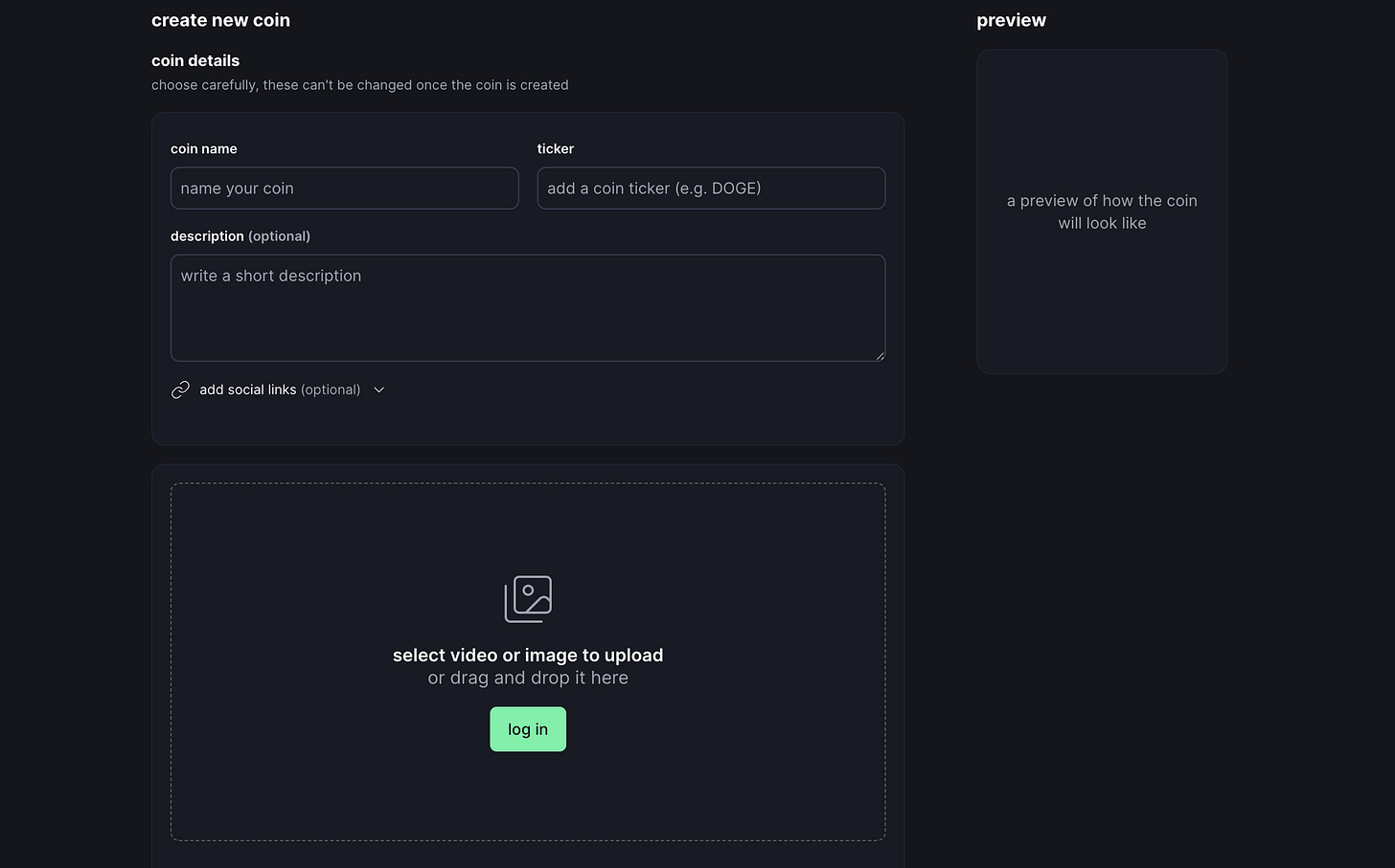 Pump[.]funの最大の特徴は、プログラミング不要で誰でも「トークンを即時発行・取引開始」できる点です。ユーザーは画像ファイル、トークン名、ティッカー(銘柄コード)を入力し、約2ドル相当のネットワーク手数料を支払うだけで新たなトークンを発行できます。