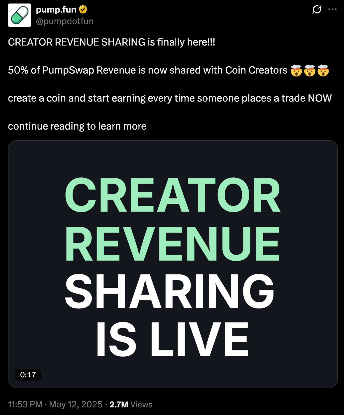クリエイター収益共有プログラム:2025年5月、ミームコイン開発者へのインセンティブ強化策として収益シェアモデルの導入を発表。これはPumpSwapで発生する全取引手数料収入の50%をトークン作成者へ還元する制度で、公式発表によれば取引ごとに手数料0.05%相当を開発者が得られる計算になります。対象となるのは(1)Pump.fun上で新規発行されたトークン、(2)現在Pump[.]fuの内部プールで取引中のトークン、(3)過去に卒業してPumpSwap上場済みのトークンのいずれかに該当する場合で、条件を満たす開発者は自分の「コイン」ページから報酬受取を申請できます。