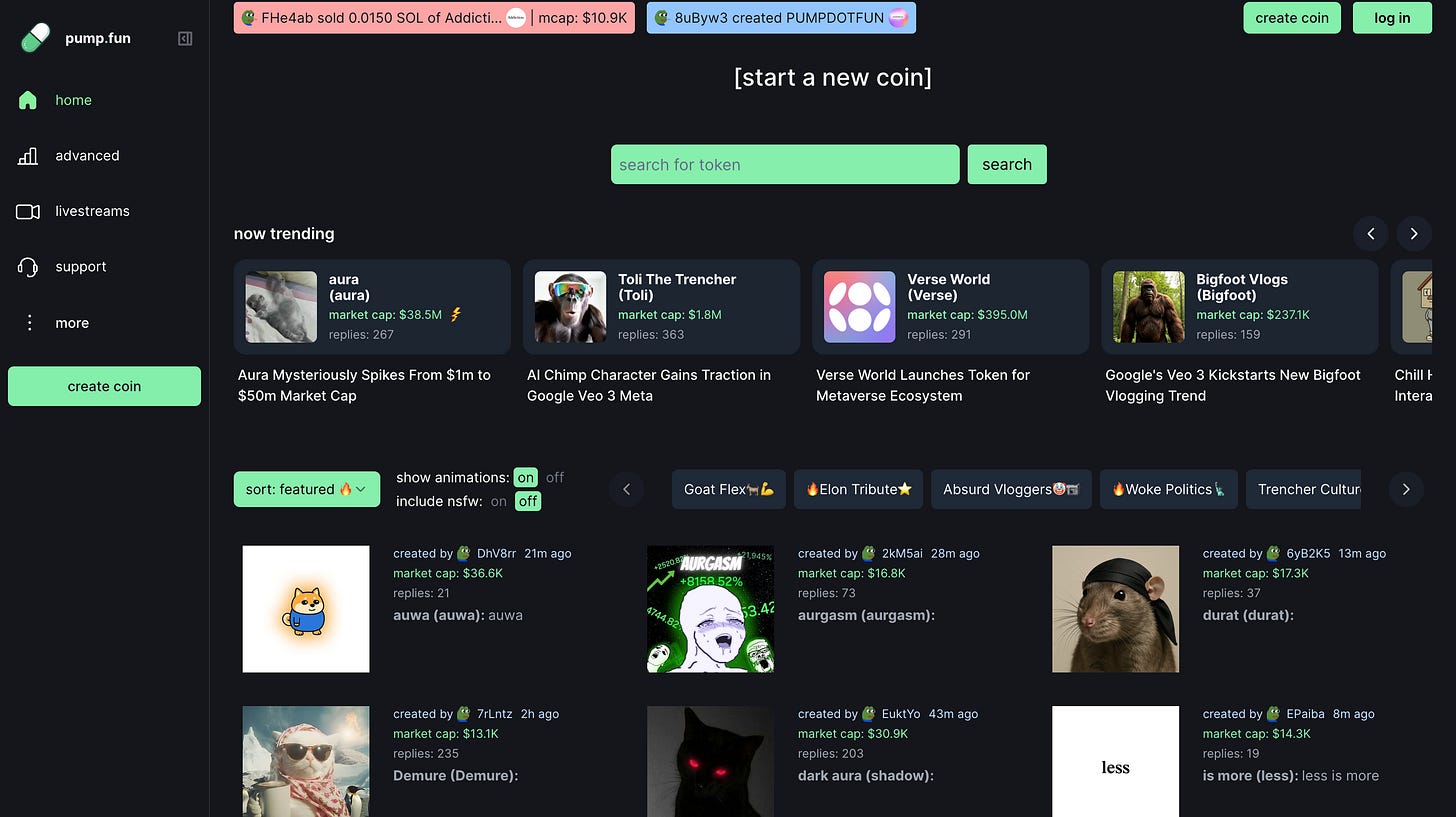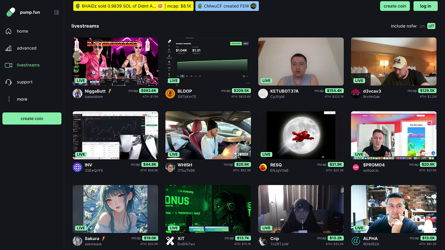 ライブストリーミング:2024年中頃に独自のライブストリーミング機能を導入。トークン開発者(コイン作成者)が自分のトークンを売り込むためにリアルタイム配信できる仕組みで、新規コインが玉石混交で大量発生する中で注目を集めるマーケティング手段となりました。しかし、この配信機能は急速に過激化し、閲覧者の関心を引くために刑務所から配信していると称したり、性的行為を生中継したり、ロシアンルーレットを行う、他人を水責めすると脅すといった極端なコンテンツが横行するようになります。こうした「やりすぎ」行為はコミュニティ内外で物議を醸し、2024年11月には主要メディアも巻き込んだ批判を受けて配信機能は無期限停止となりました。ただし、ライブ配信規約を作り込んだ後、現在は復活しています。