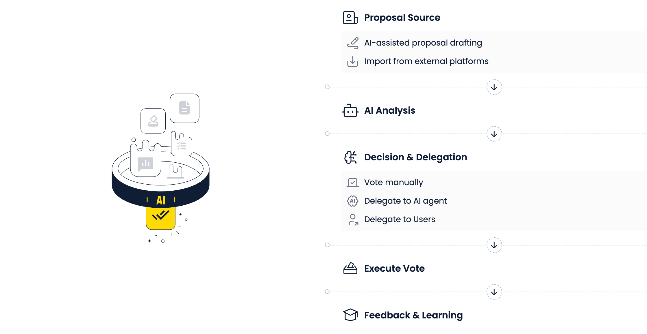 ユーザーはあらかじめ自分の投票ポリシーや支持傾向をAIに設定(またはAI側が提案内容に応じて最適判断)し、投票権をAIエージェントに託します。AIエージェントはユーザーの利益に沿うかたちで、自動的かつ即座に投票を行います。