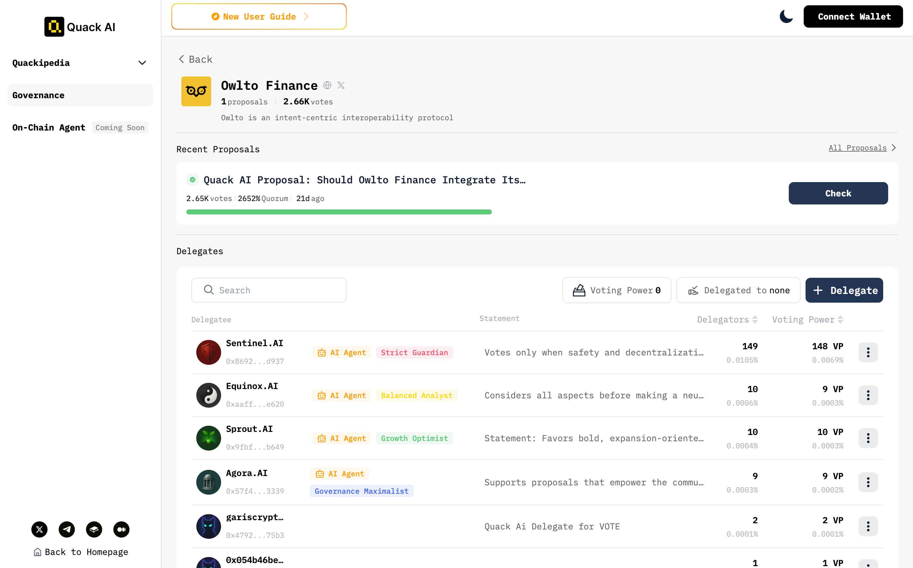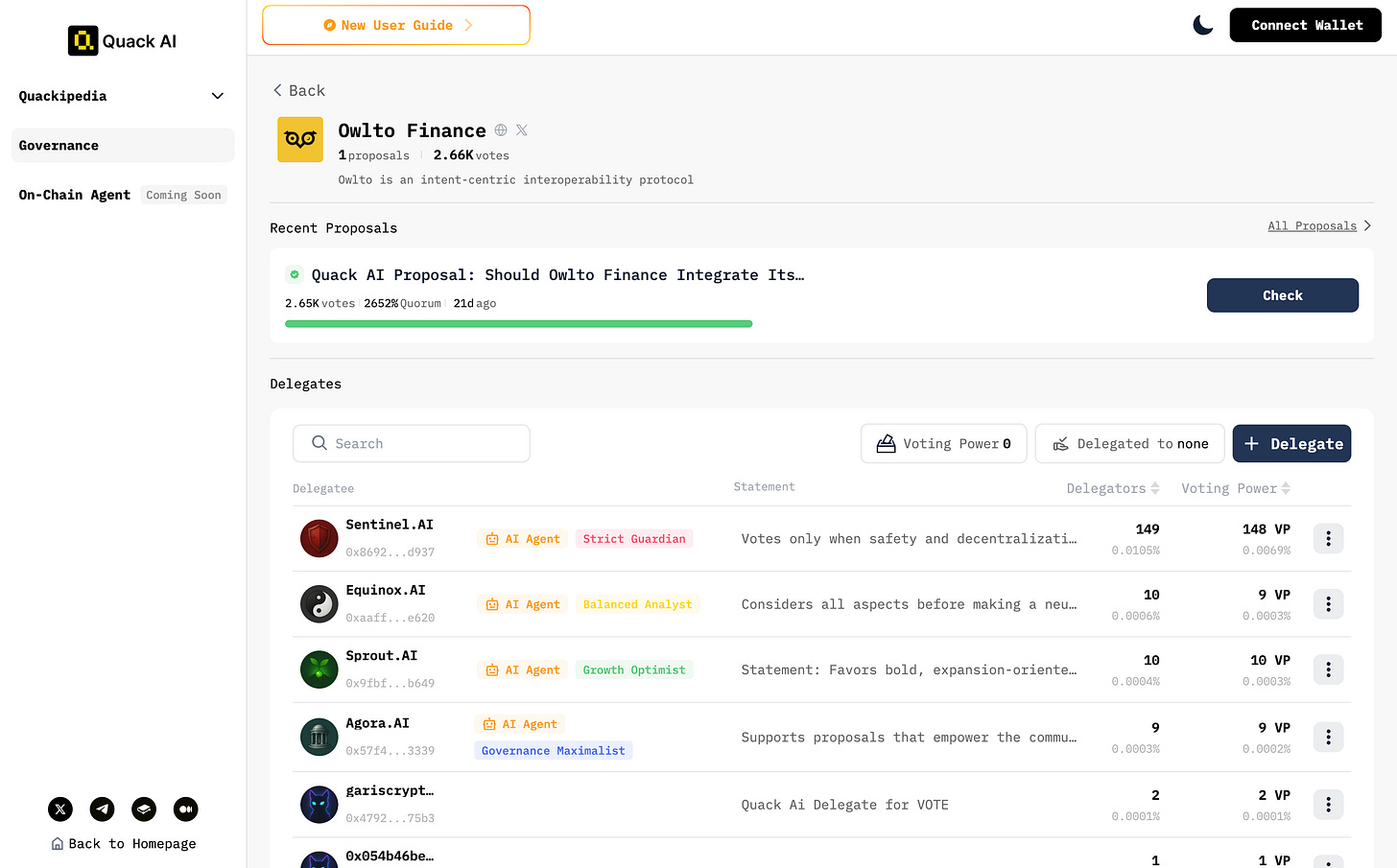 Quack AIは「AIガイド+人間の操縦」というガバナンス哲学を掲げており、重要な判断には人間のチェックや介入余地が設けられています。ユーザーはAIエージェントに投票委任していても、いつでも手動で介入し上書きする権限を持っています。