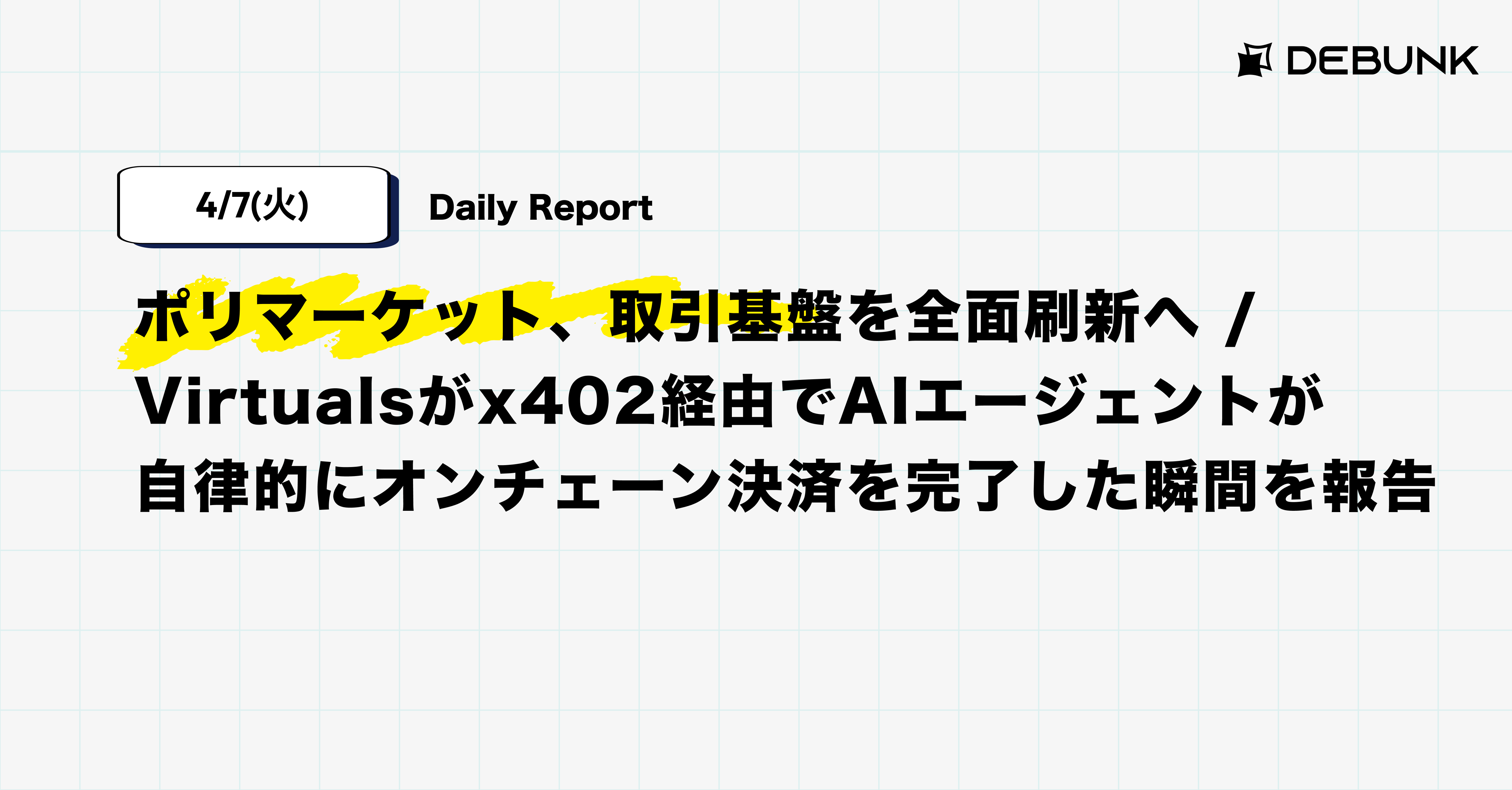 【4/7(火)Daily Report】ポリマーケット、取引基盤を全面刷新へ / Virtualsがx402経由でAIエージェントが自律的にオンチェーン決済を完了した瞬間を報告など